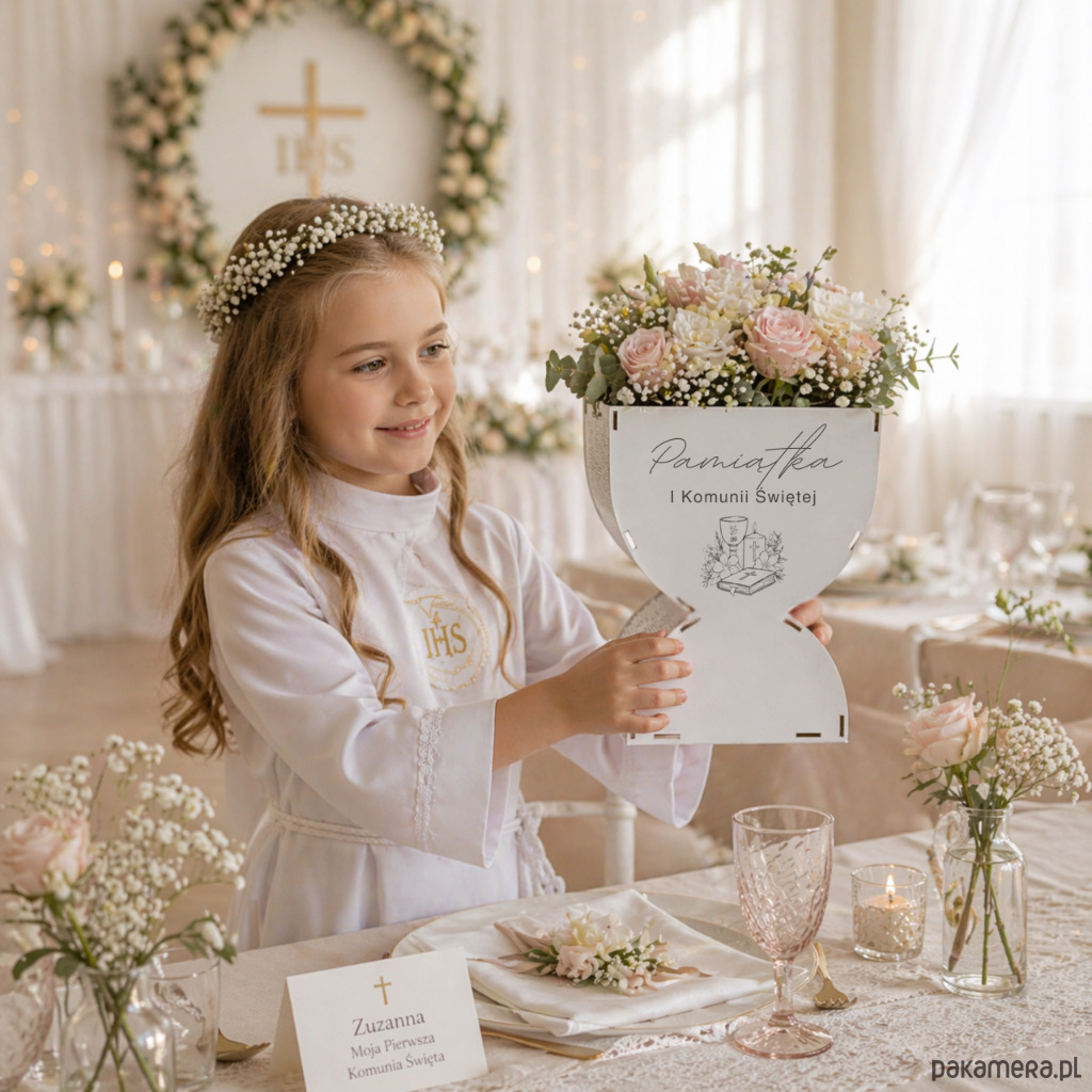 Wyjątkowy kielich w formie pudełka wykonany z białej płyty HDF jednostronnie laminowanej to elegancka dekoracja komunijna, która łączy estetyczny wygląd z praktycznym zastosowaniem. Symboliczny kształt kielicha doskonale podkreśla charakter Pierwszej Komunii Świętej, a jednocześnie może służyć jako pudełko na prezent, słodycze lub pamiątkowe drobiazgi.To nowoczesna i stylowa alternatywa dla klasycznych opakowań prezentowych.