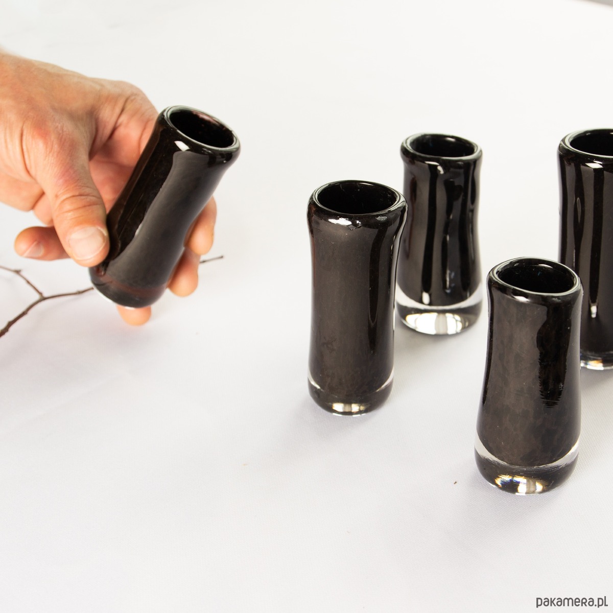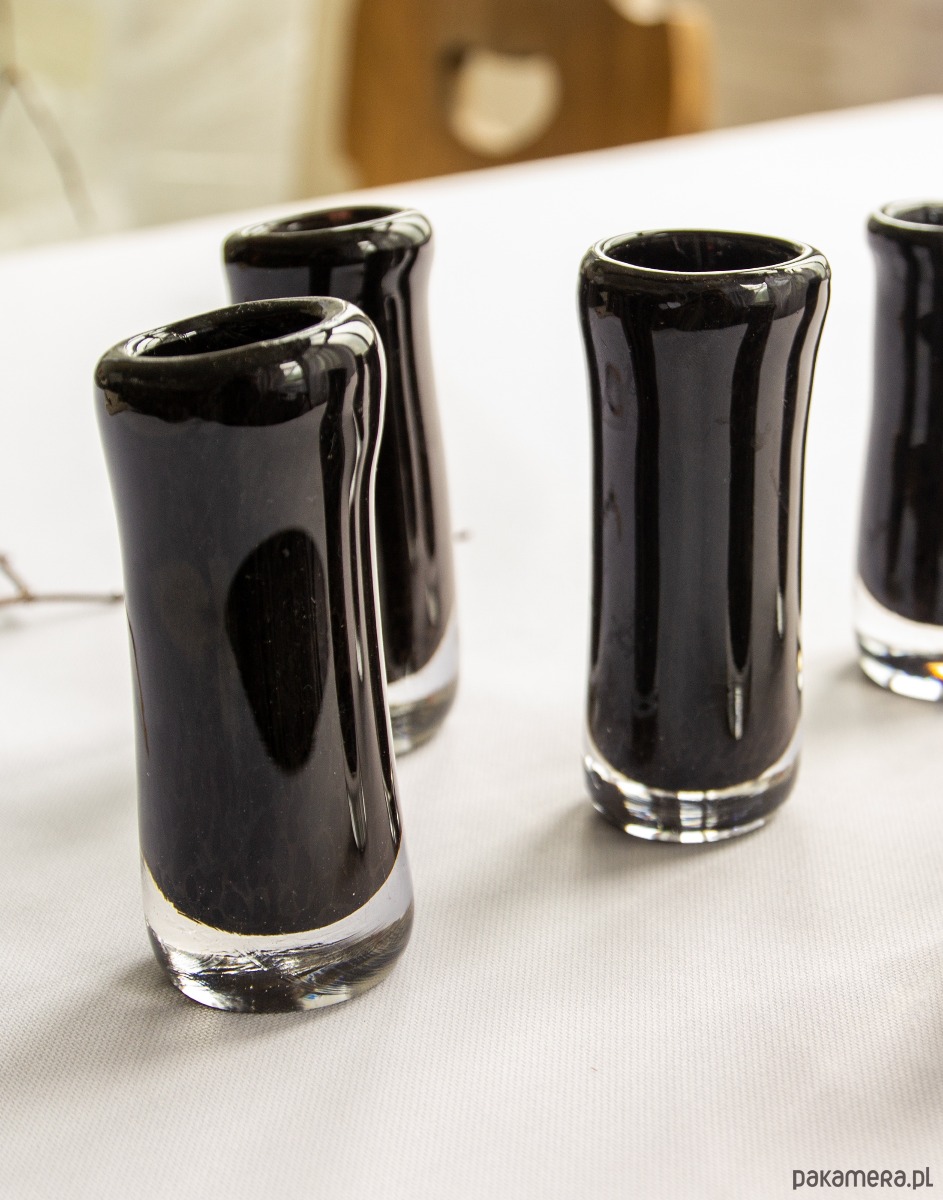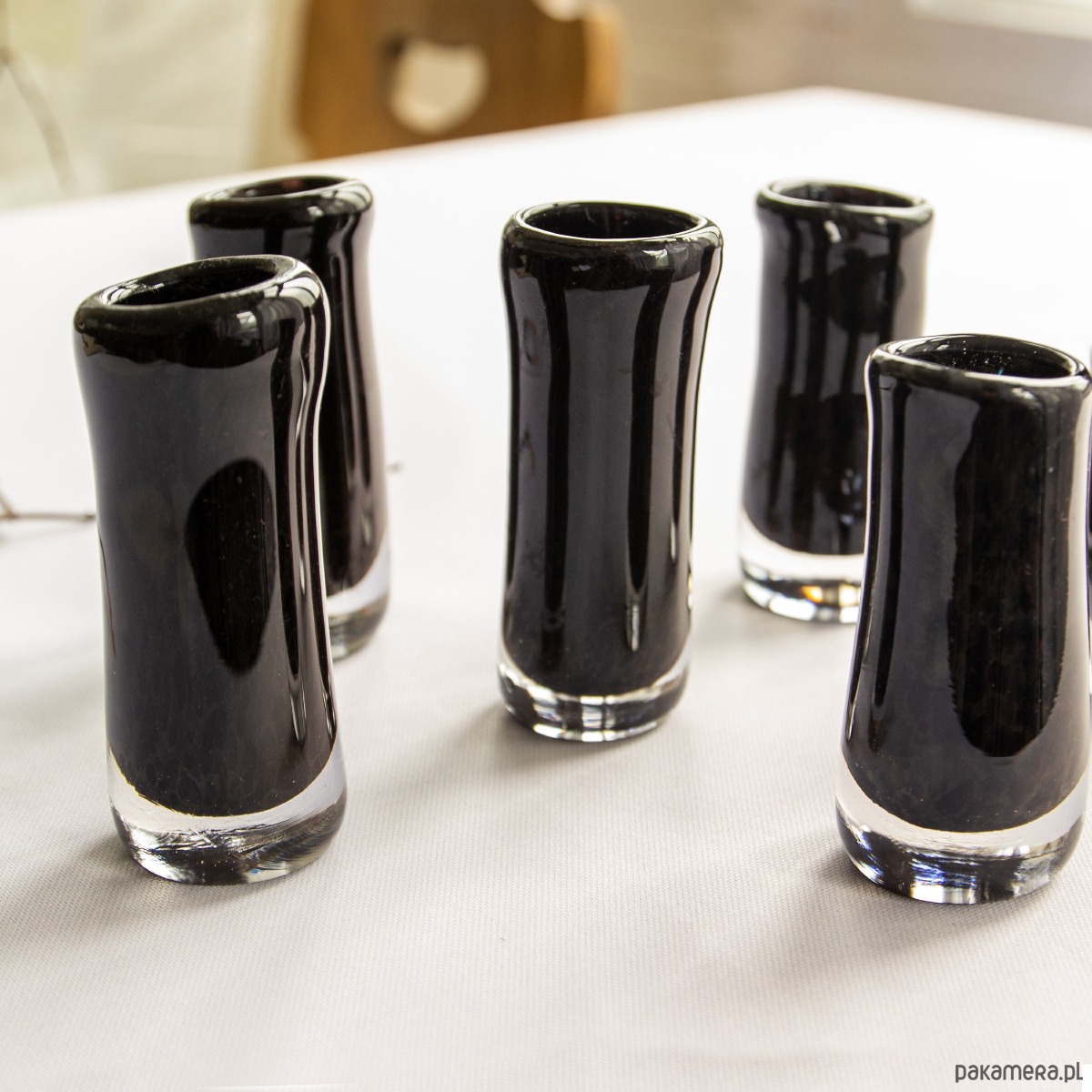 Shoty – kieliszki ręcznie formowane, dzięki temu pomimo tej samej barwy i kształtu są unikatowe, różnią się między sobą nieznacznie kształtem grubością i wysokością, a więc również pojemnością, którą w tym projekcie potraktowałem z przymrużeniem oka, a która w produkcji masowej była by nie do zaakceptowania.