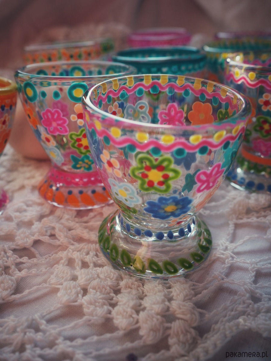 Ręcznie malowane kieliszki do jajek to wyjątkowy dodatek, który wprowadzi kolor do każdego śniadania. Żywe barwy sprawdzą się doskonale na co dzień i od święta, a kwiatowy wzór to uniwersalny rozweselacz stołu. Każdy kieliszek jest inny, jedyny w swoim rodzaju.