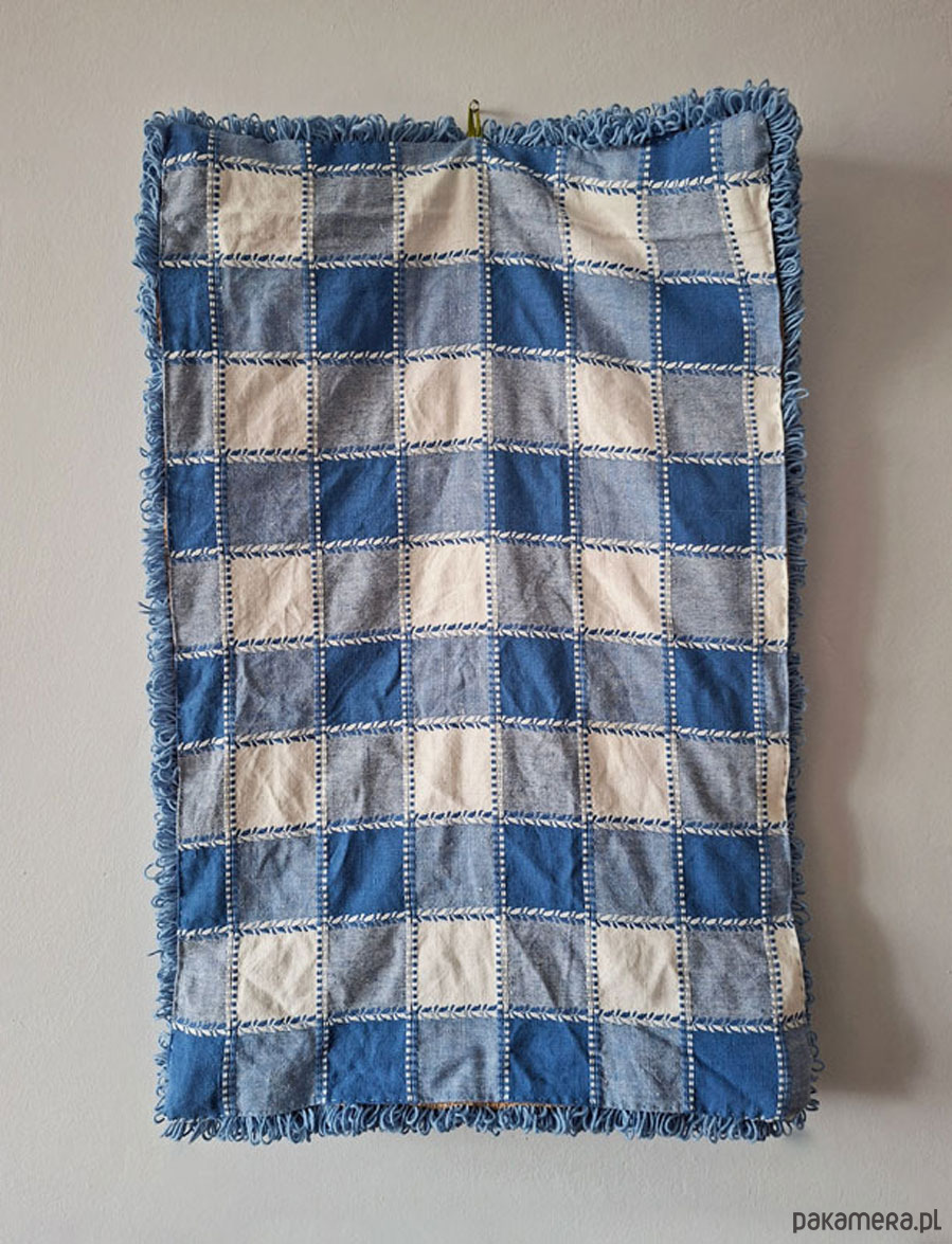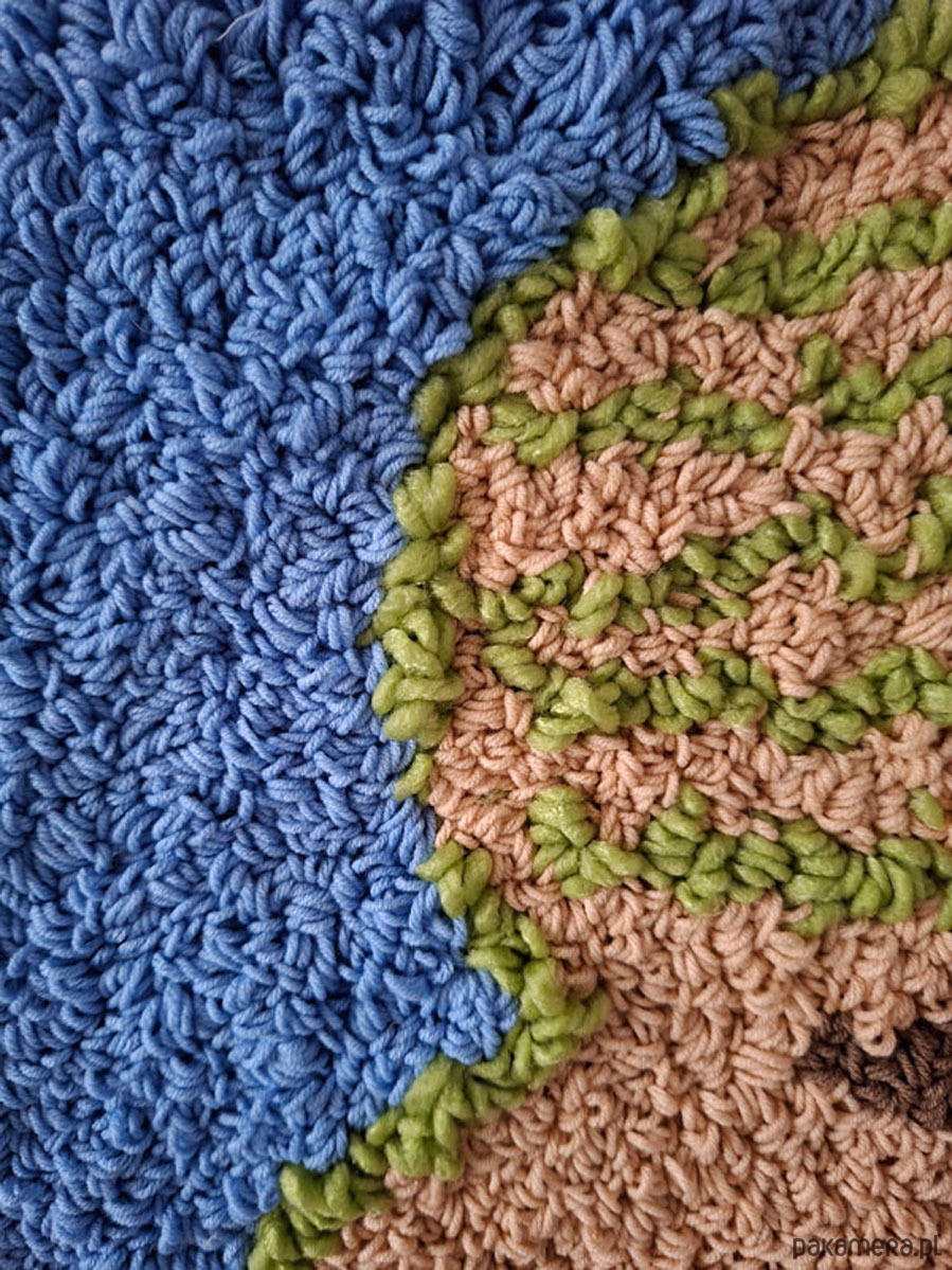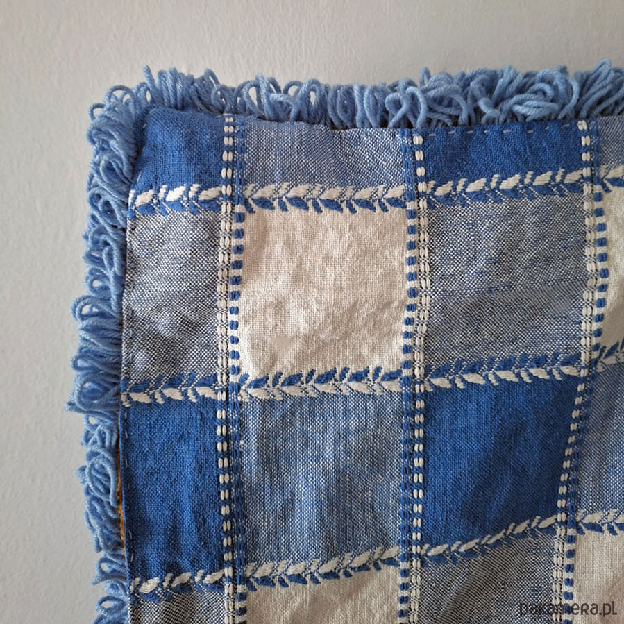 Haftowany wóczką na bazie z juty. Spód podszyty solidnym kraciastym płótnem.