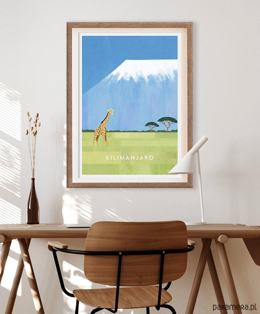 Plakat podróżniczy w intensywnie niebieskich barwach ukazuje najwyższą i najbardziej rozpoznawalną górę Afryki. Zwykle samotny masyw na plakacie za towarzystwo ma uroczą, pomarańczową żyrafę.