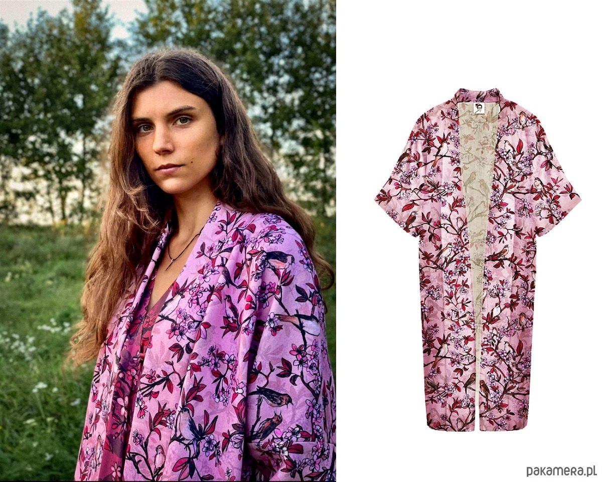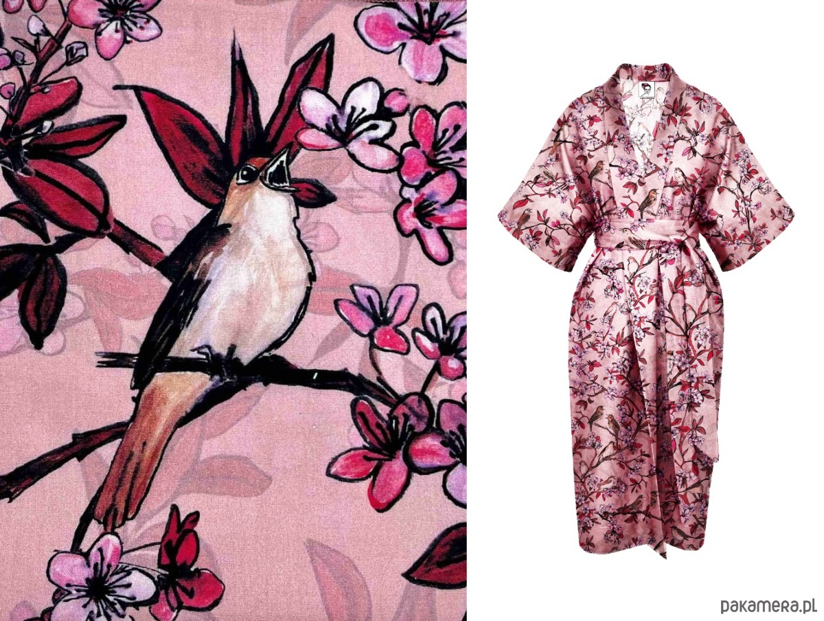 kwiatowe KIMONO uszyte z tkaniny wiskozowej w ręcznie malowany wzór SŁOWIKI w kwitnących wiśniach.