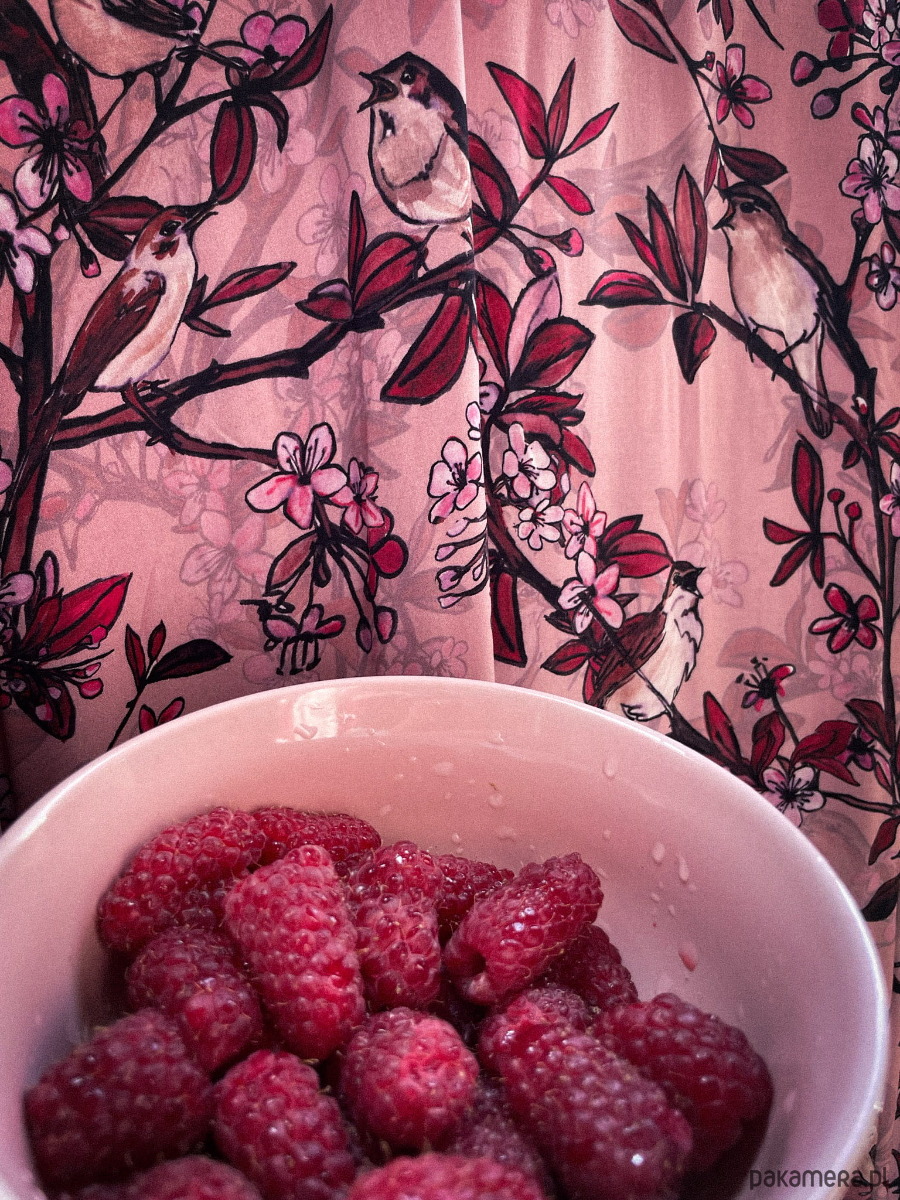 Kolorystyka printu SŁOWIKI RÓŻOWE to chłodny, intensywny róż płatków kwiatów na ciepłym różowym tle (brudny róź) z czarnym konturem.