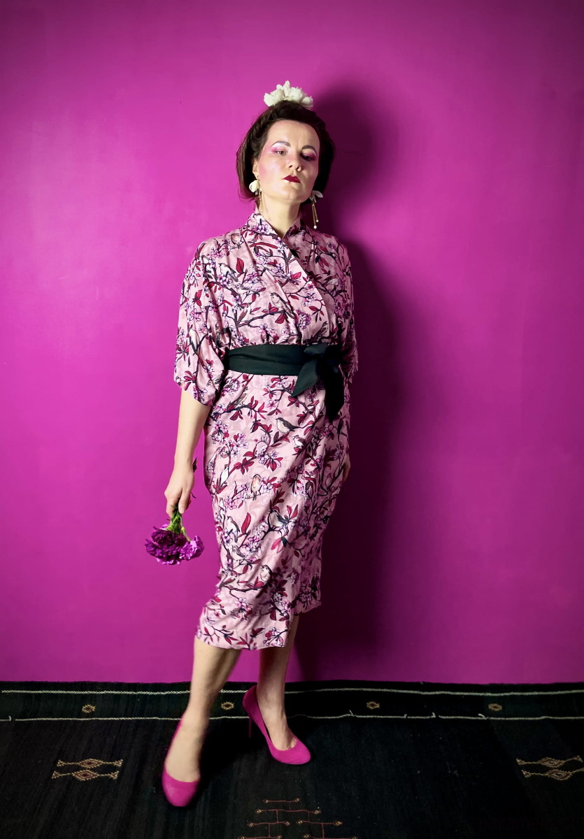 Kopertowy krój dopasujesz do każdej figury i podkreślisz talię paskiem. (spokojnie - ciałolubny onesize upraszcza życie - tu nie da się nie trafić z rozmiarem!)
