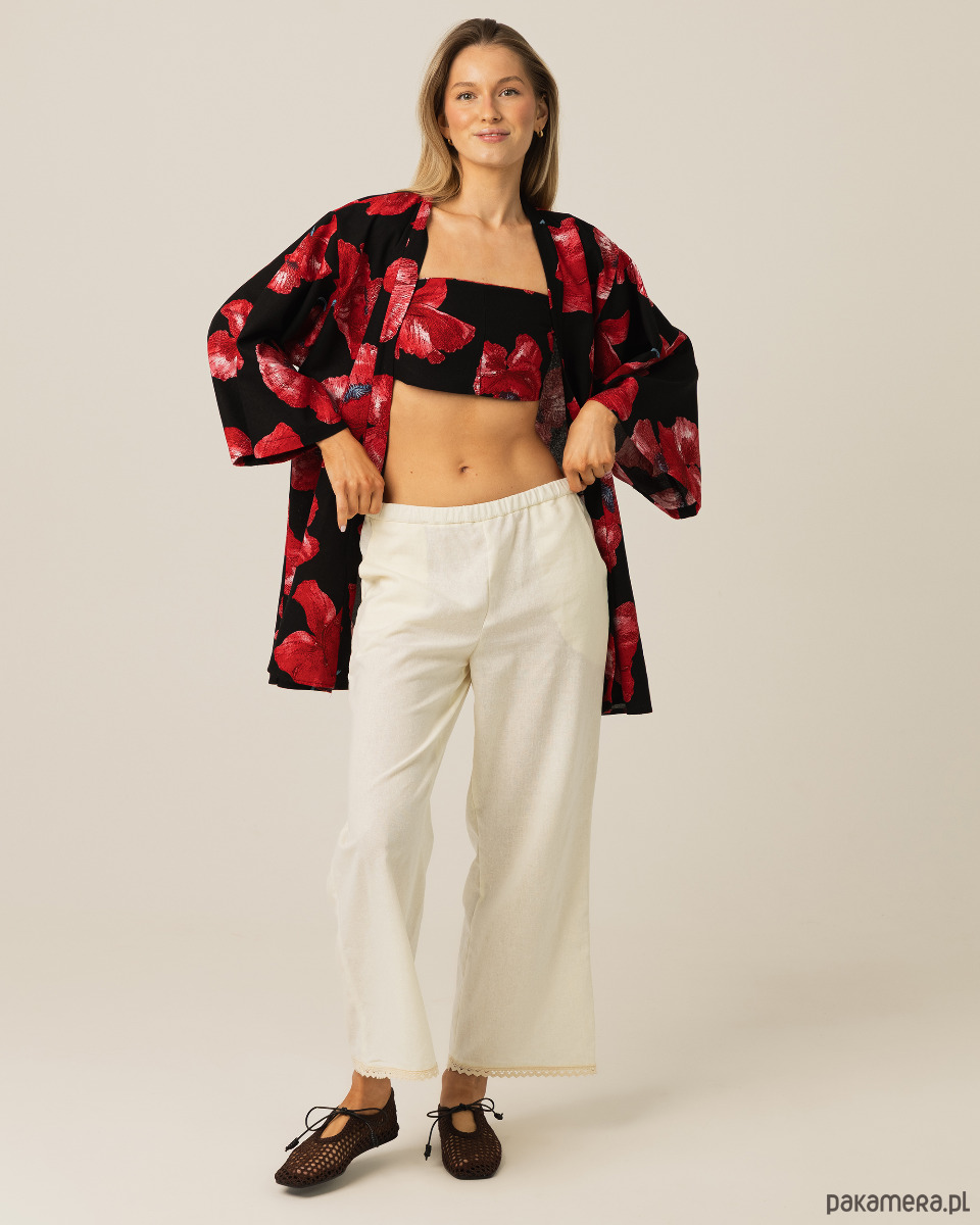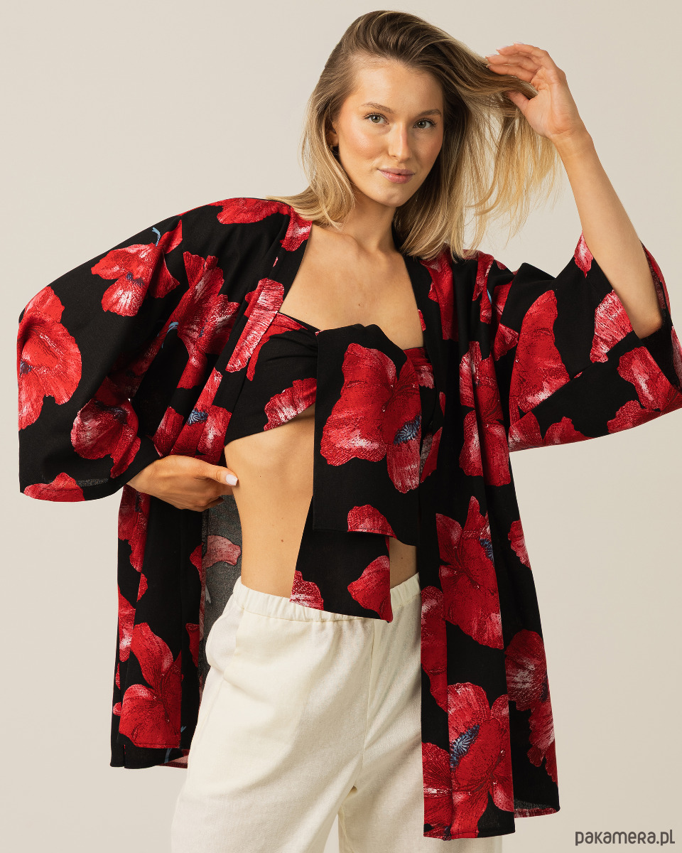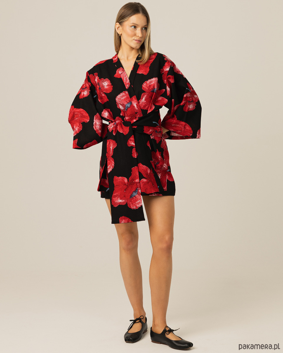 Model inspirowany japońskim kimonem w nowoczesnej, codziennej wersji. Sprawdzi się zarówno podczas relaksu na tarasie, jak i jako lekka sukienka na wyjście.