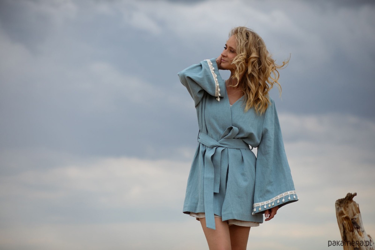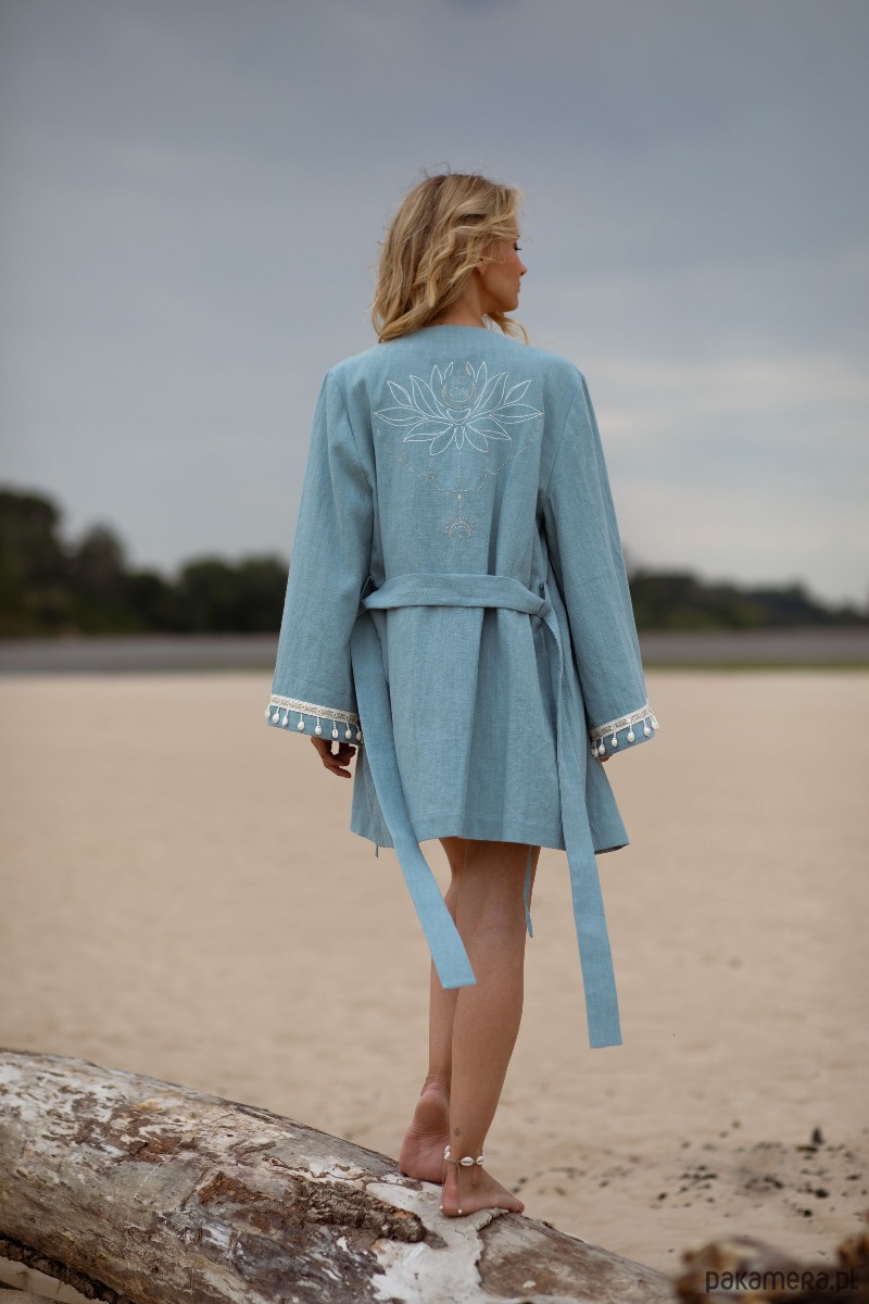 Krótkie kimono z lnu stonewashed, o prostej formie i długich rękawach, przepasane szarfą. Wewnątrz posiada troczki do zawiązania, które umożliwiają noszenie go także jako sukienki. Rękawy ozdobione taśmą z muszlami Kauri, na plecach zaś, znajduje się subtelny haft z kwiatem lotosu, na szarfie wyhaftowany logotyp Ragane.