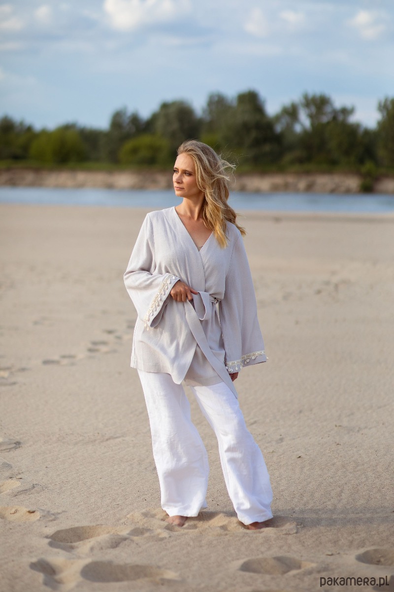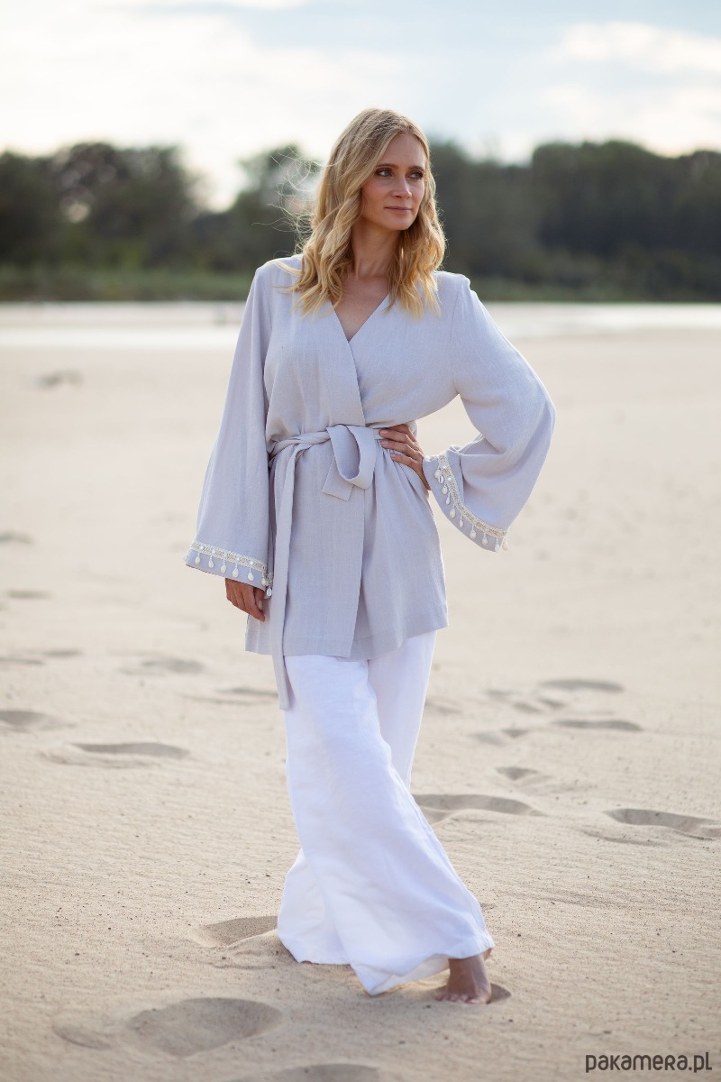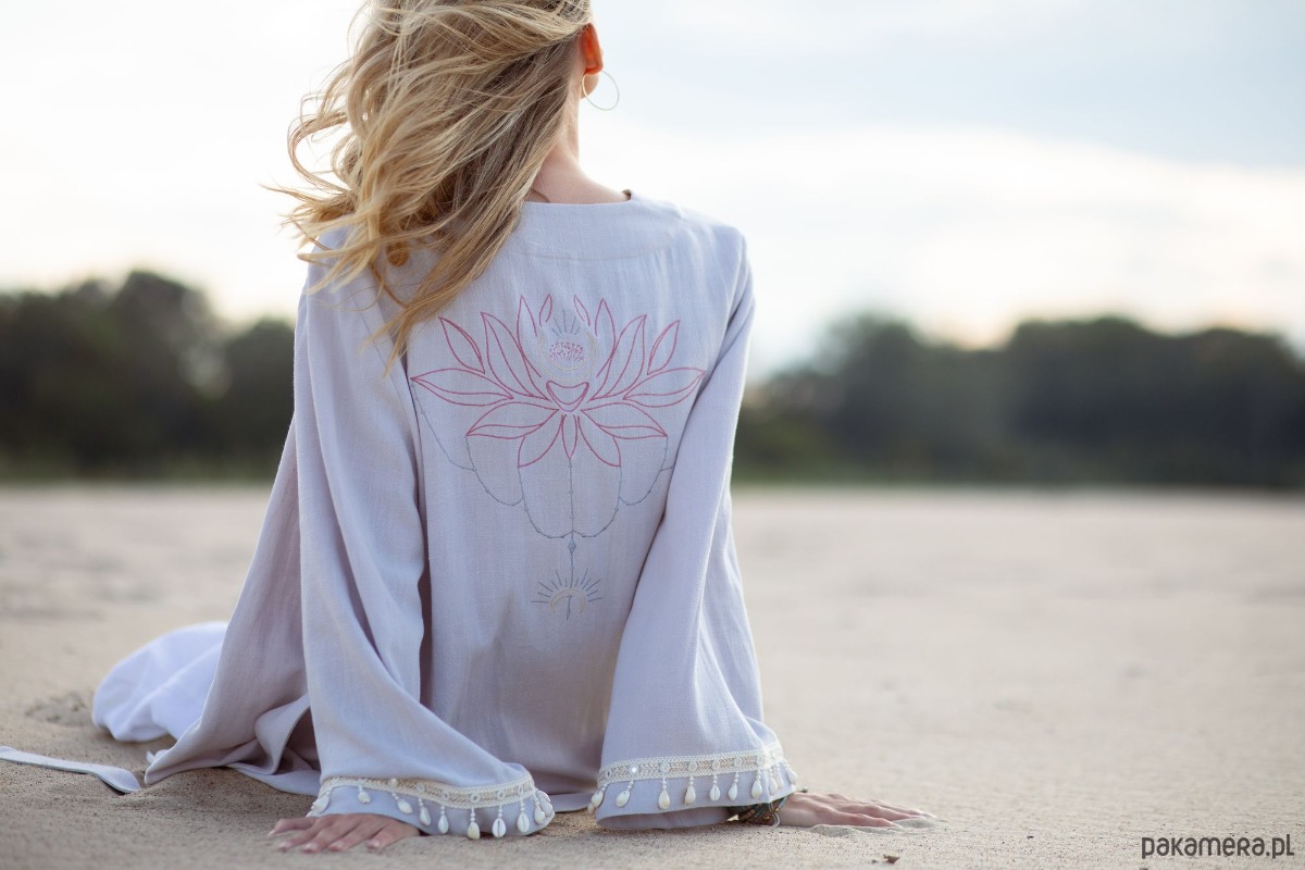 Kimono krótkie, uszyte jest z wiskozy z domieszką lnu, o prostej formie i długich rękawach, przepasane szarfą. Wewnątrz posiada troczki do zawiązania, które umożliwiają noszenie go także jako sukienki. Rękawy zdobione taśmą z muszlami Kauri, na plecach zaś, znajduje się subtelny haft przedstawiający kwiat lotosu, na szarfie wyhaftowany jest logotyp Ragane.