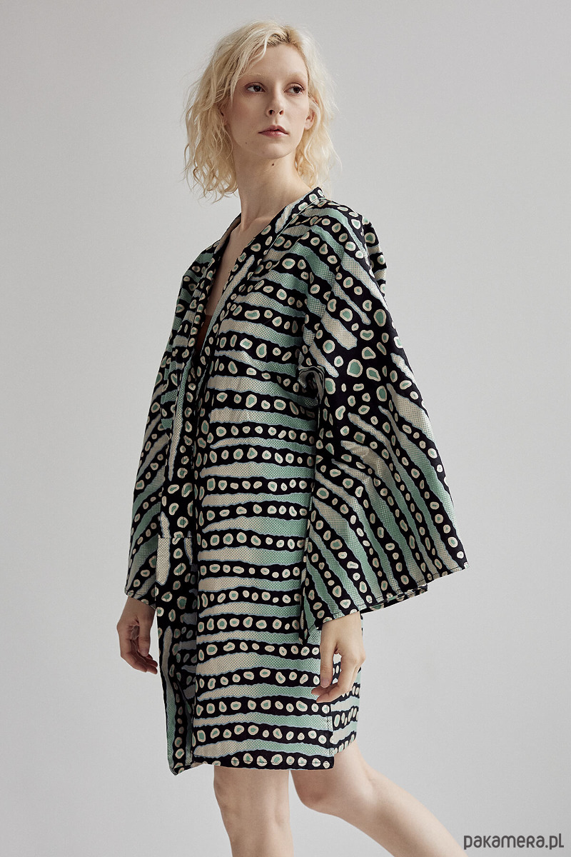 Piękne kimono z bawełnianej tkaniny African Wax Print. Ten ostatni egzemplarz ma proste rękawy. Dwustronny wzór, trwałe soczyste kolory i wygodny krój zadowolą najbardziej wymagające istoty. Tworzymy w duchu slow fashion, w małej pracowni krawieckiej w środkowej Polsce. Kimono ma delikatny metaliczny blask, który dodaje mu pazura i elegancji.