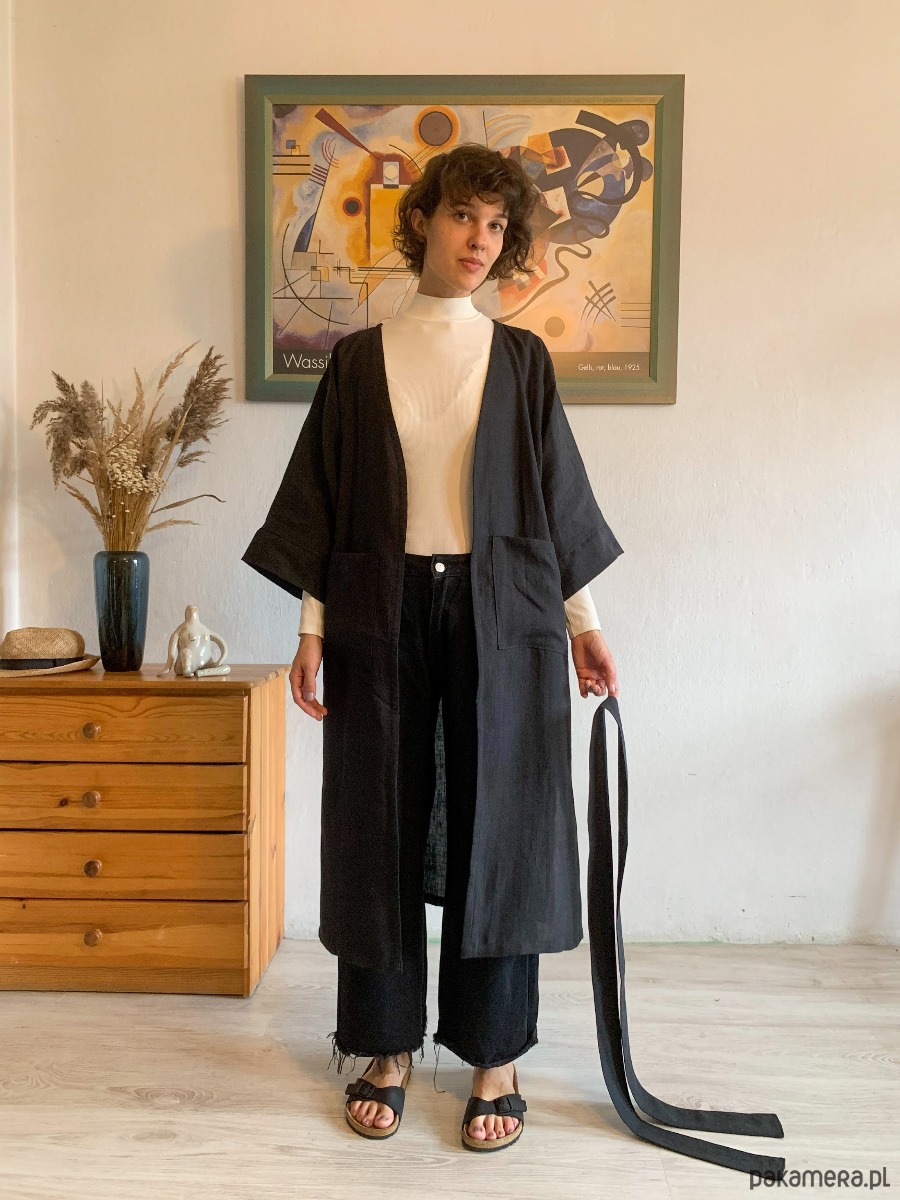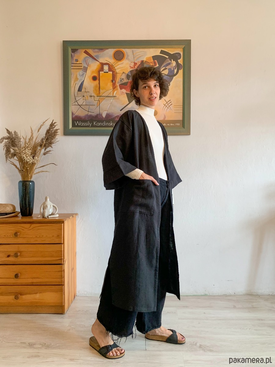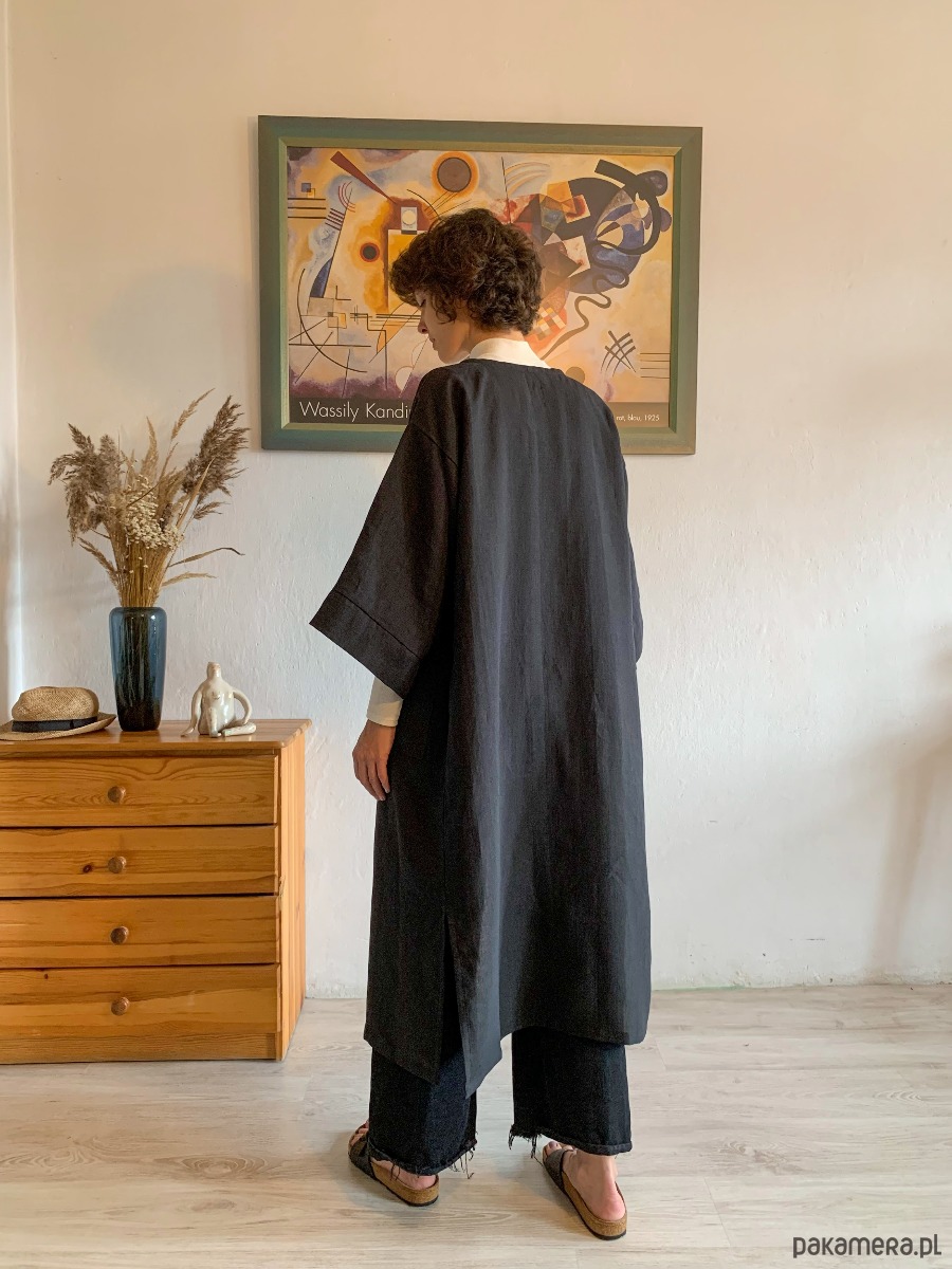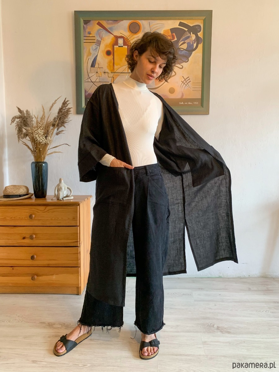 Kimono MIRA doczekało się wyjątkowej wersji l o n g. Kimono płaszcz, z obszernymi kieszeniami z przodu, paskiem do przewiązania i rozporkami po boku. Można nosić je jako luźną narzutę związane w pasie lub elegancki szlafrok. Feel free. Miękki, bardzo przyjemny len wysokiej jakości sprawi że poczujesz się wyjątkowo.