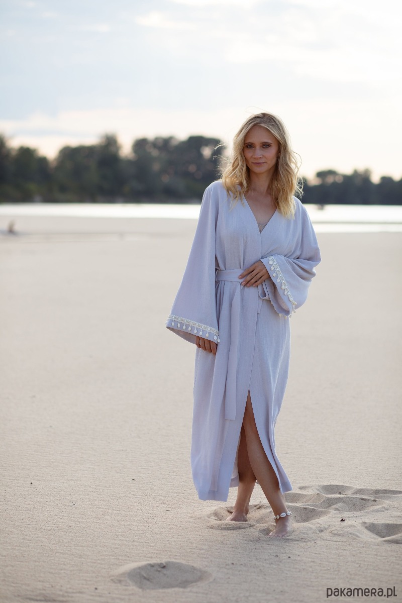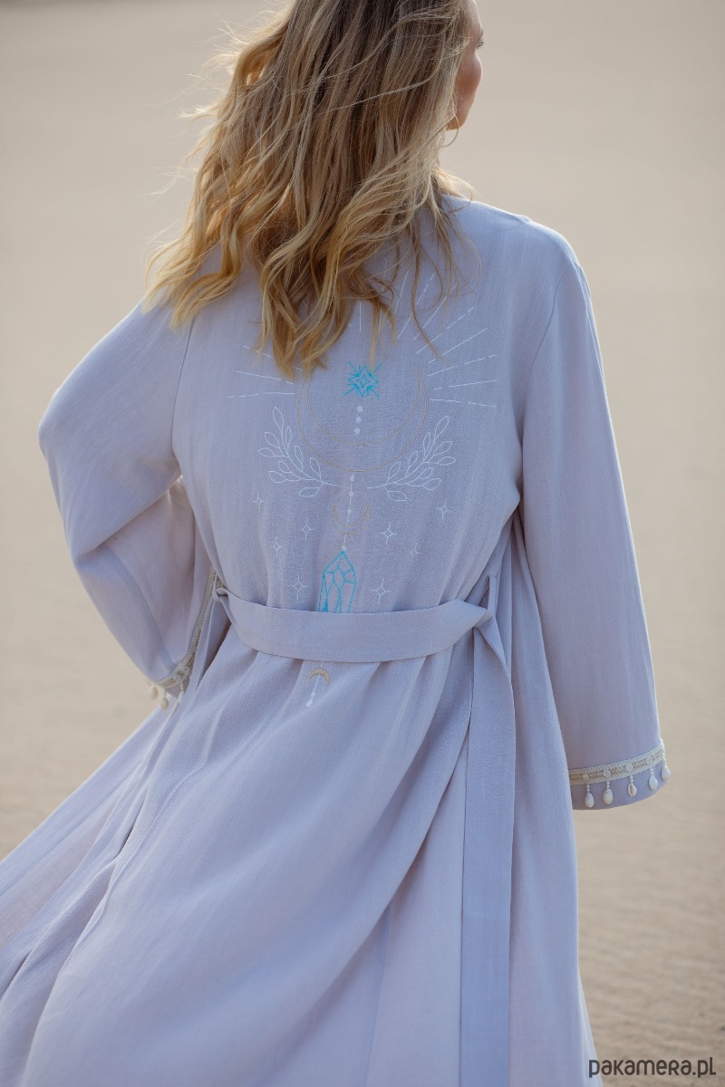 Długie kimono, uszyte jest z wiskozy z domieszką lnu, o prostej formie i długich rękawach, przepasane szarfą. Wewnątrz posiada troczki do zawiązania, które umożliwiają noszenie go także jako sukienki. Rękawy zdobione taśmą z muszlami Kauri, na plecach zaś, znajduje się subtelny haft księżycowy, na szarfie wyhaftowany jest logotyp Ragane.