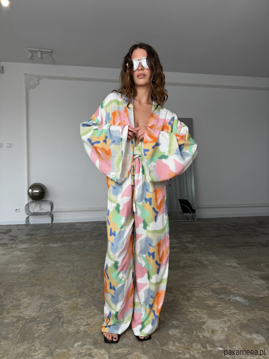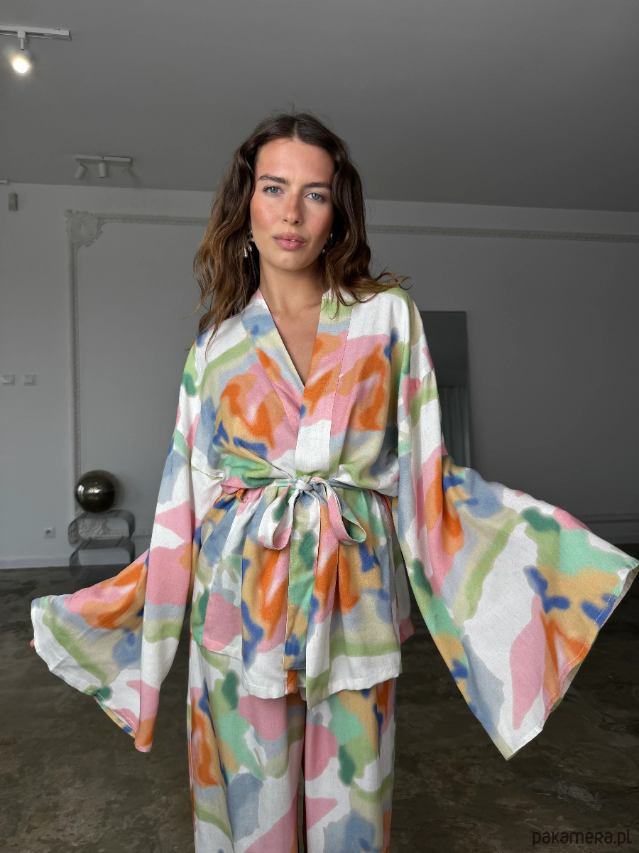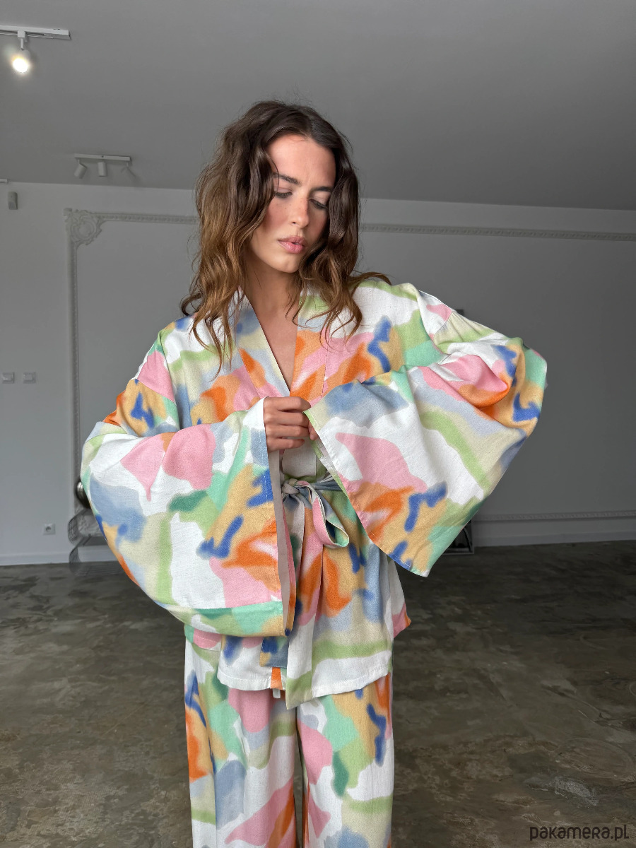Kimono Pekin Happy Colors to nowoczesna interpretacja klasycznej formy inspirowanej japońskim kimonem, wzbogacona o wyrazisty, artystyczny print. Wielokolorowa kompozycja nadaje modelowi unikalnego charakteru i sprawia, że staje się on centralnym elementem stylizacji.