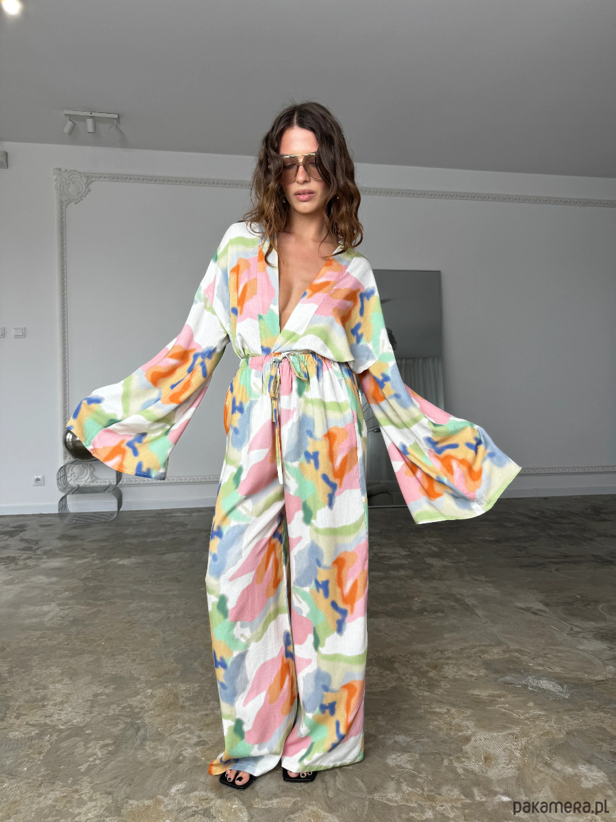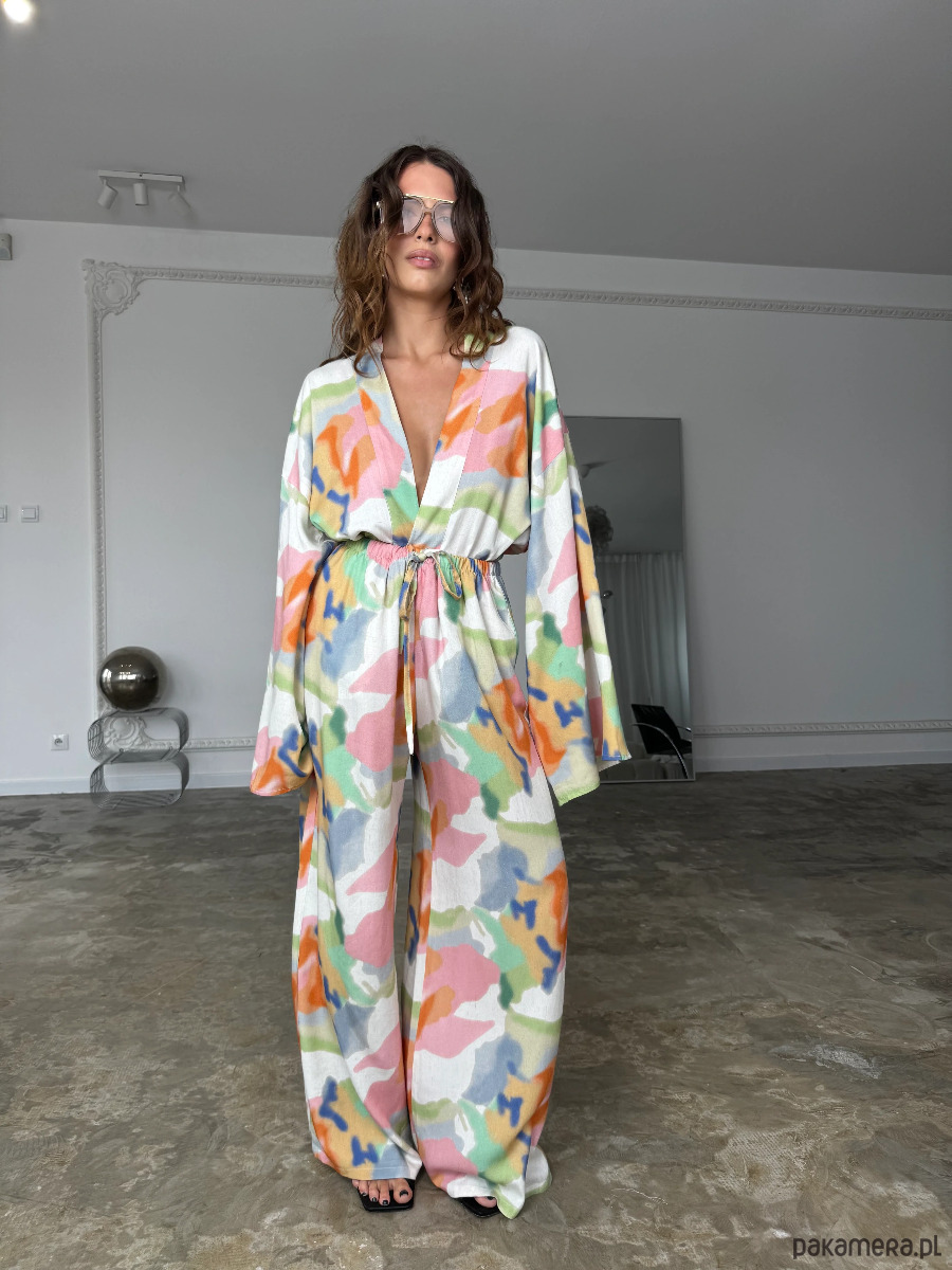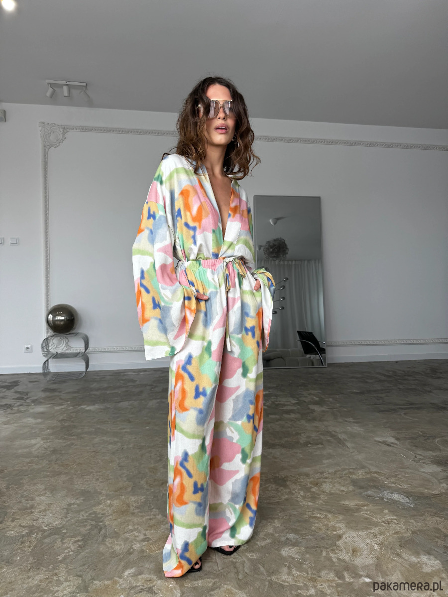 Kimono Pekin Happy Colors to nowoczesna interpretacja klasycznej formy inspirowanej japońskim kimonem, wzbogacona o wyrazisty, artystyczny print. Wielokolorowa kompozycja nadaje modelowi unikalnego charakteru i sprawia, że staje się on centralnym elementem stylizacji.