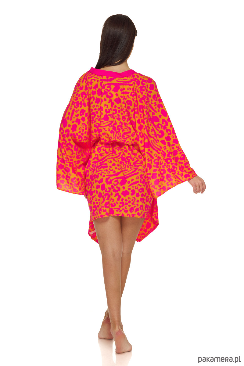 Narzutka plażowa w modny, panterkowy wzór będzie świetnym wyborem przy kompletowaniu wakacyjnej garderoby. Idealnie zaprezentuje się na plaży narzucona na kostium kąpielowy, dzięki swojemu krojowi będzie dobrze leżeć na każdej sylwetce, a dołączony neonowy pasek pozwoli na dopasowanie jej w talii. Możesz narzucić ją na strój kąpielowy lub codzienny outfit.