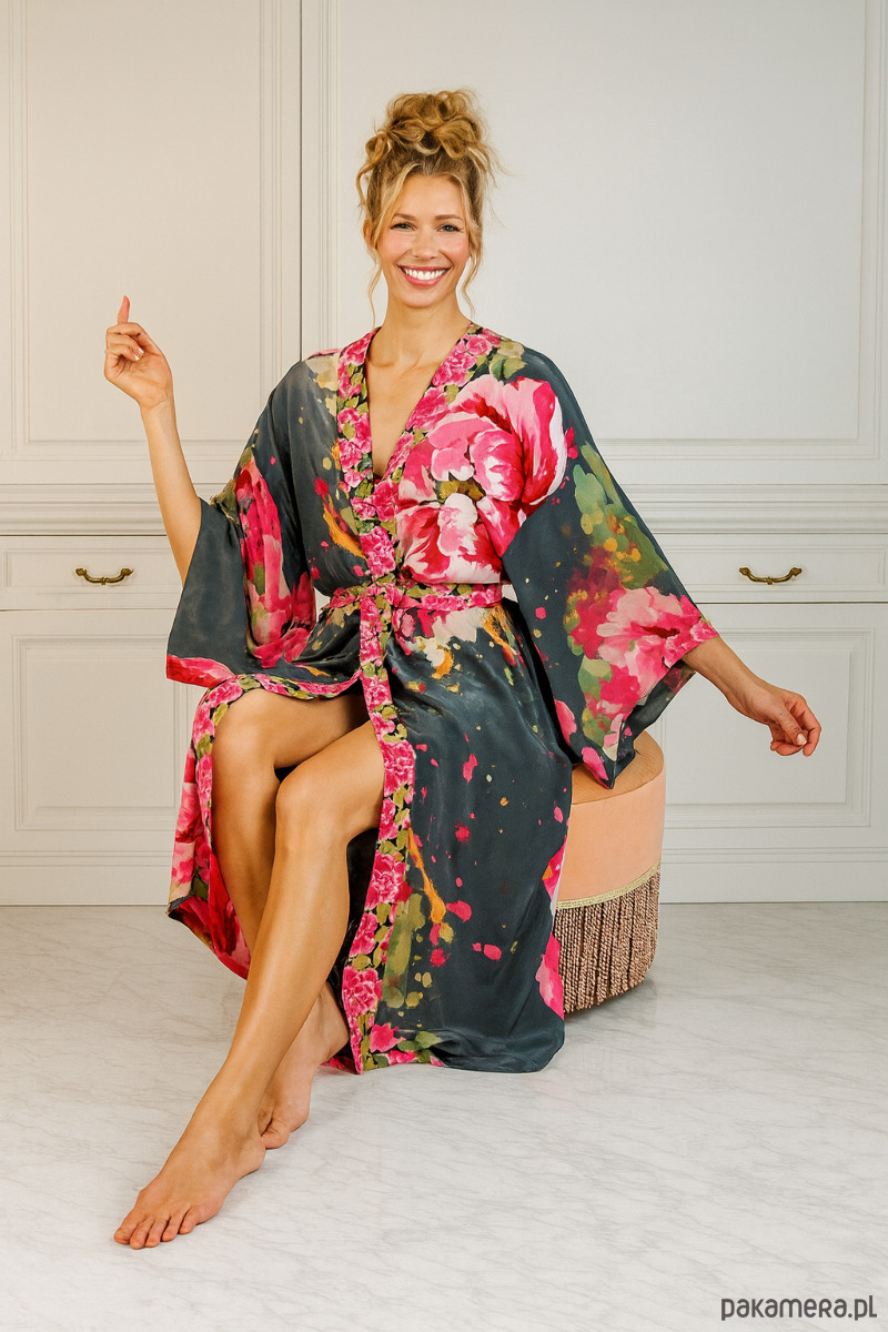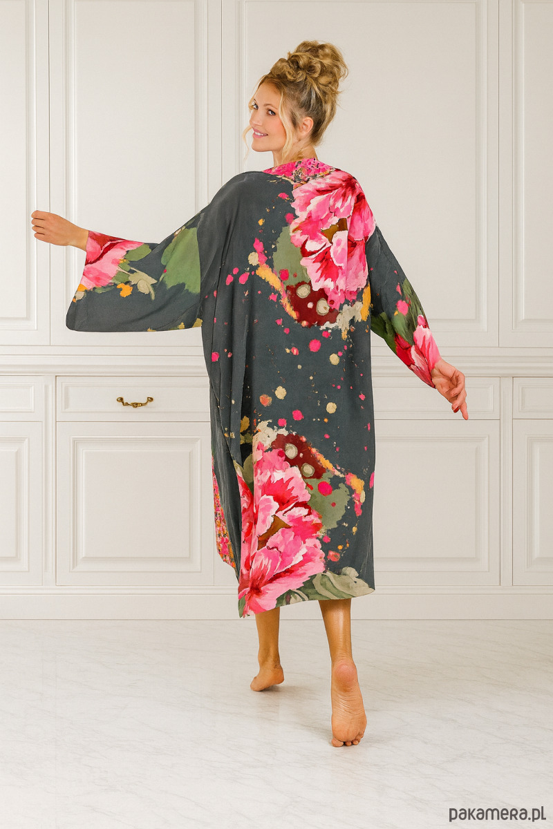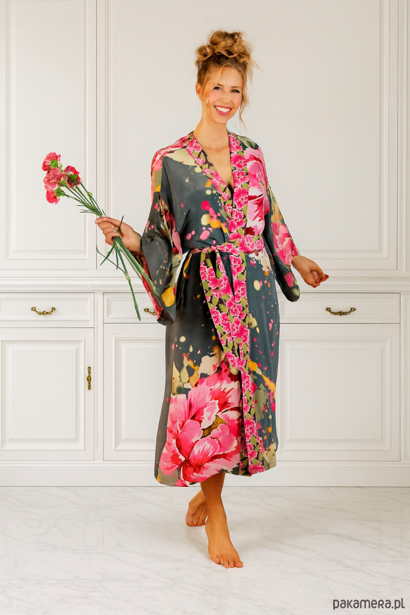 Czarująca i egzotyczna gra kolorów i dbałość o szczegóły w tym projekcie szlafroka sprawiają, że jest to coś niezwykle efektownego. Można nosić przepasany paskiem w stylu sukni lub rozpięty.