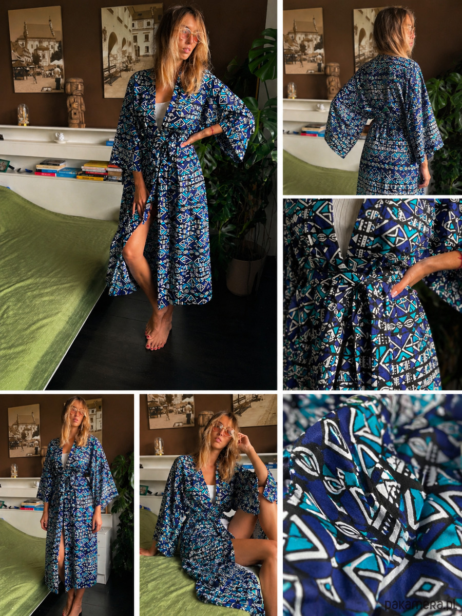 Wyjątkowej urody kimono Cape Town Blue zachwyca soczystością koloru, dwustronnym wzorem, wygodą i oryginalnością. Wykonane jest z dbałością o każdy szczegół z trwałej, bawełnianej tkaniny African Wax. Wzór na tkaninie powstał za pomocą tradycyjnej metody farbowania, inspirowanej batikiem.