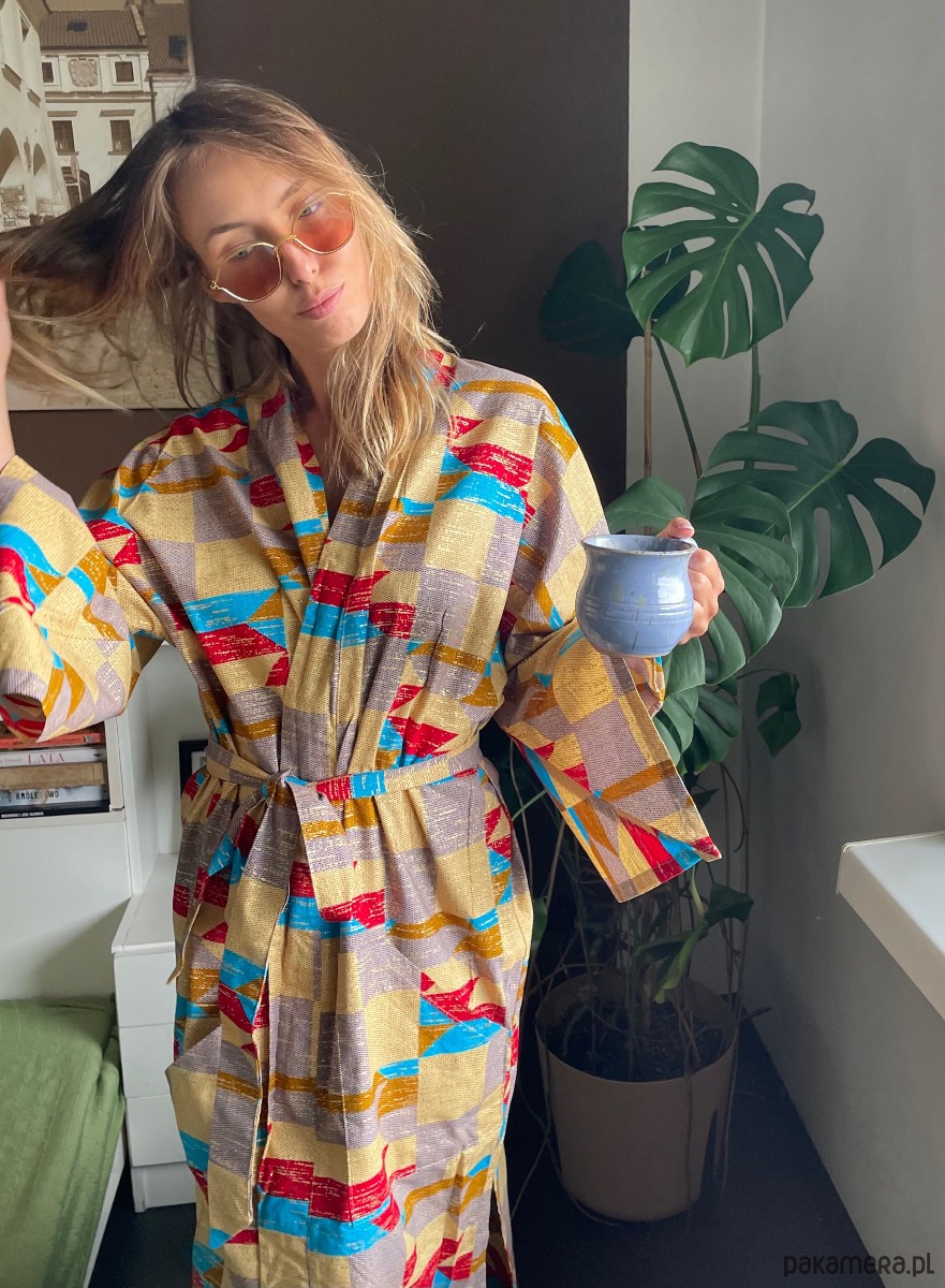 Wyjątkowej urody kimono Sahara zachwyca soczystością koloru, dwustronnym wzorem, wygodą i oryginalnością. Wykonane jest z dbałością o każdy szczegół z trwałej, bawełnianej tkaniny African Wax. Wzór na tkaninie powstał za pomocą tradycyjnej metody farbowania, inspirowanej batikiem.