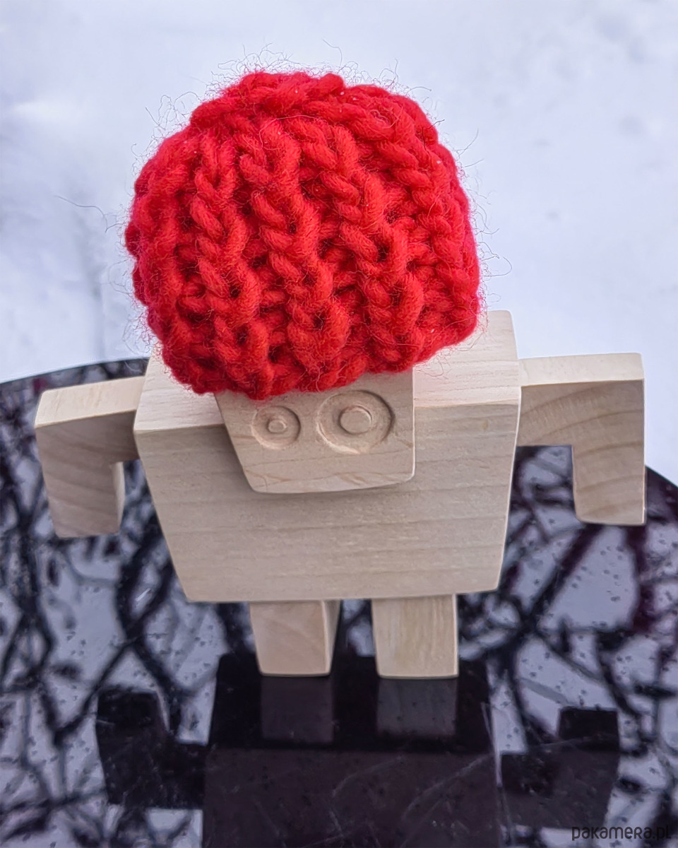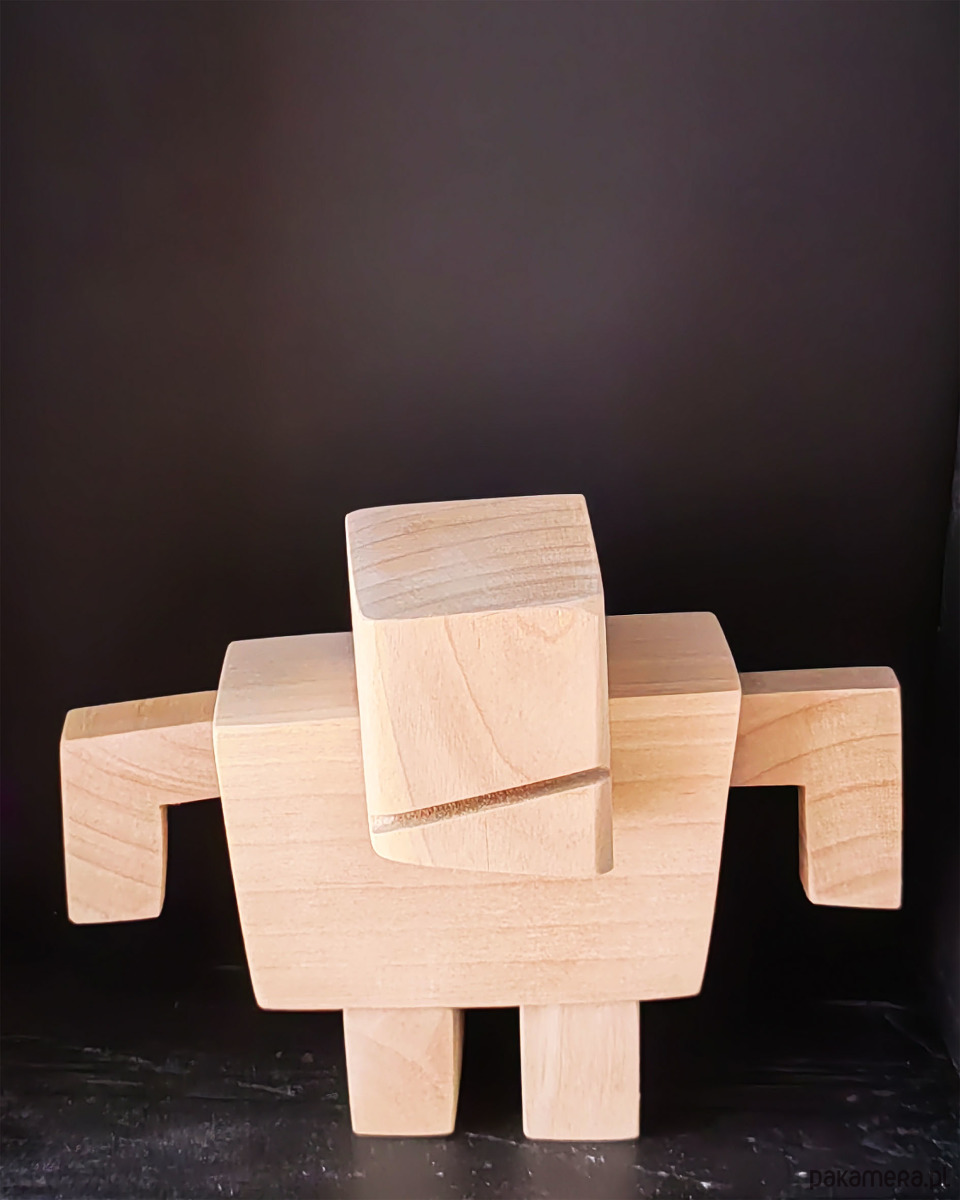 Robot jest zrobiony w 100% z dobrze wysezonowanego drewna z odzysku (plus wełniana czapeczka). Nie jest lakierowany, ani impregnowany - oszlifowane surowe drewno. Elementy robota są łączone drewnianymi kołkami na wcisk. Dzięki temu można np. poruszać ręką robota, wymienić głowę itp.