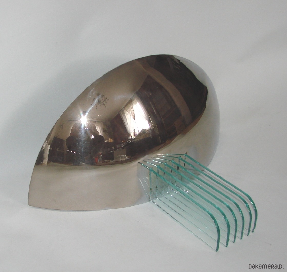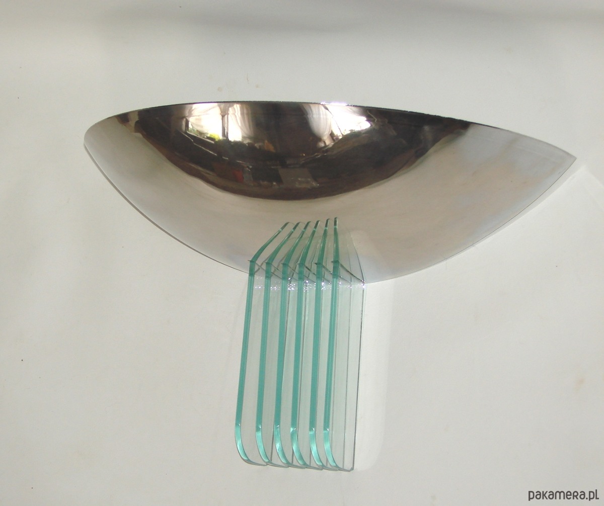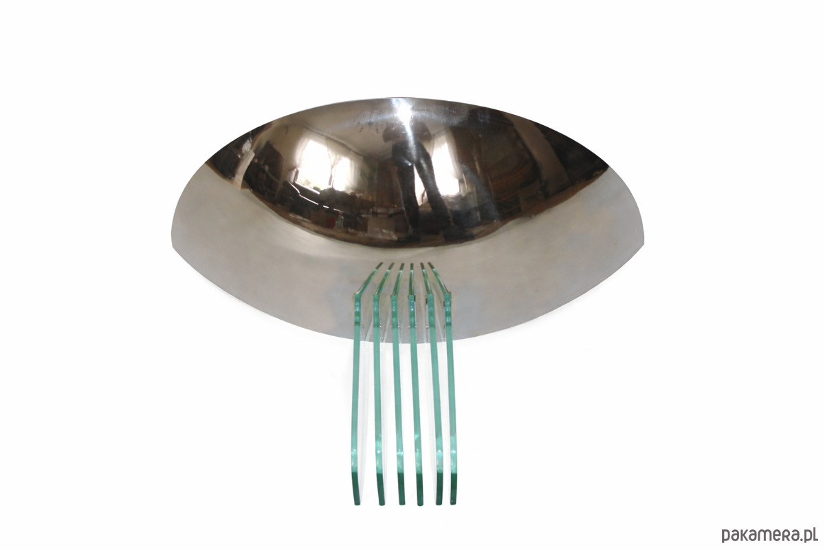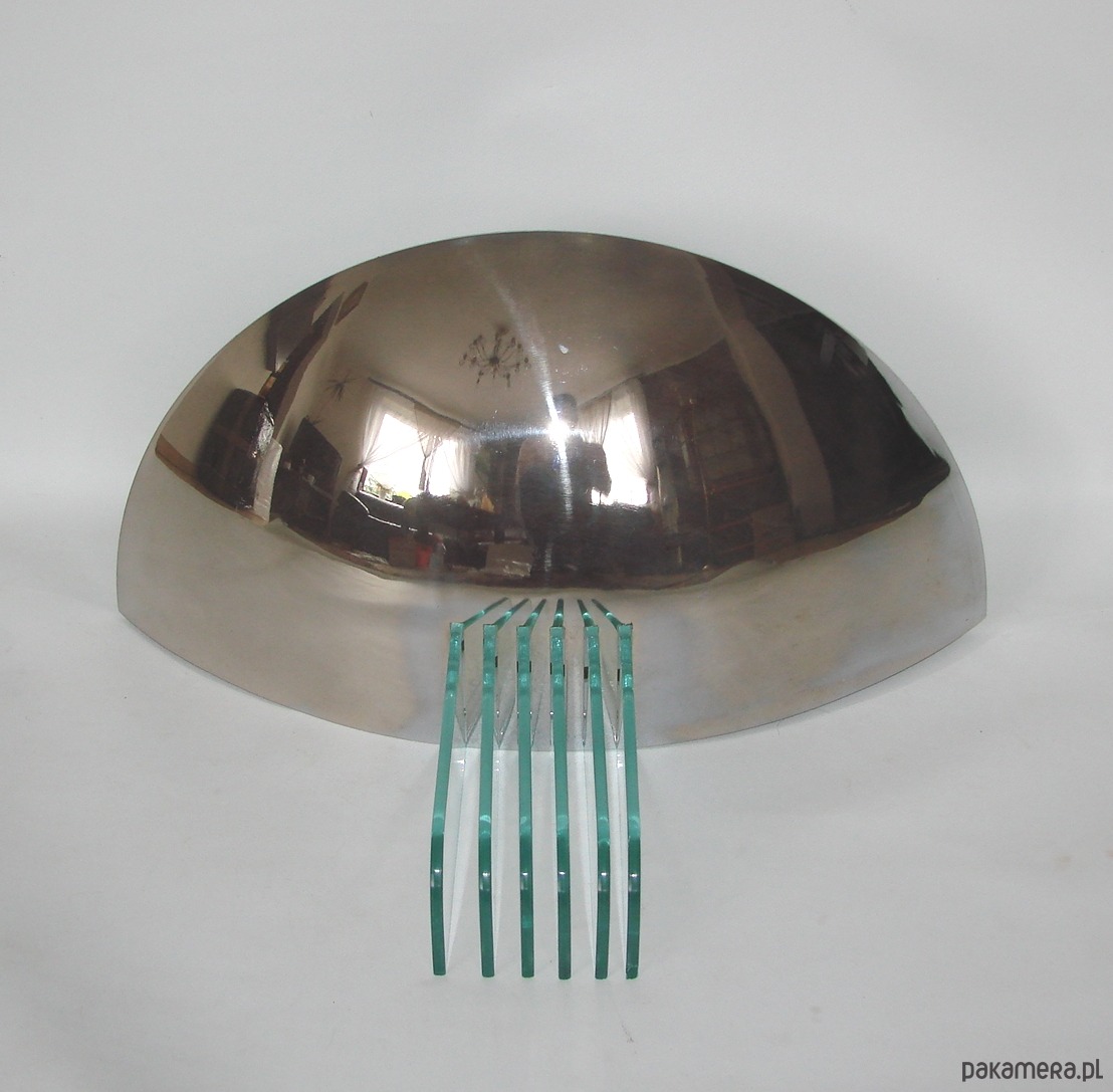 Stylowy kinkiet ścienny w estetyce Art Deco, pochodzący z lat 70. XX wieku. Wykonany z metalu oraz szkła, łączy geometryczną formę z elegancką prostotą charakterystyczną dla tego stylu.