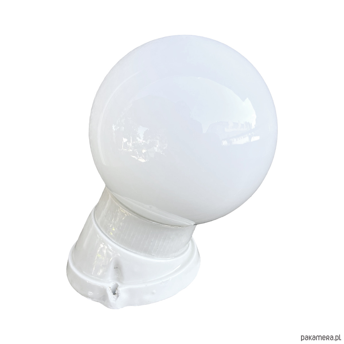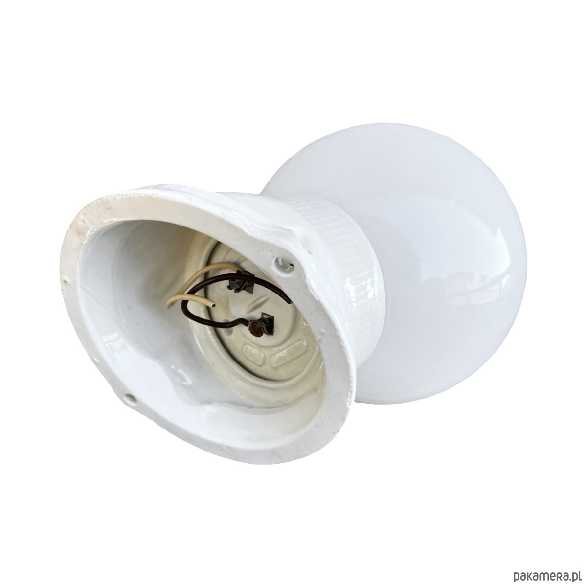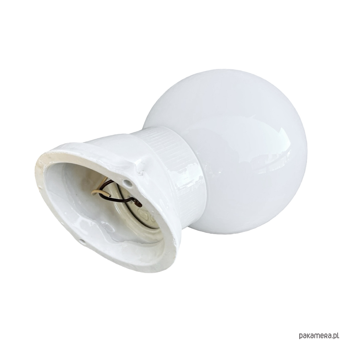 Oryginalny kinkiet ścienny w stylu industrialnym marki Lindner, pochodzący z lat 60. XX wieku. Lampa składa się z ceramicznej, skośnej podstawy oraz klosza w formie białej, szklanej kuli, co nadaje jej eleganckiego, minimalistycznego charakteru.