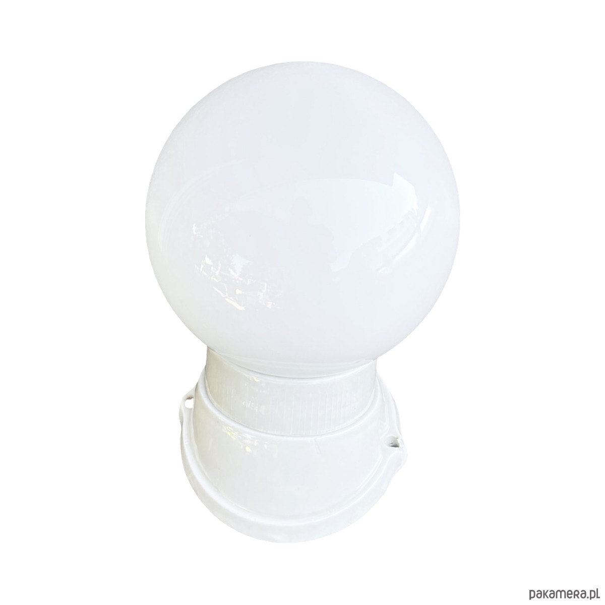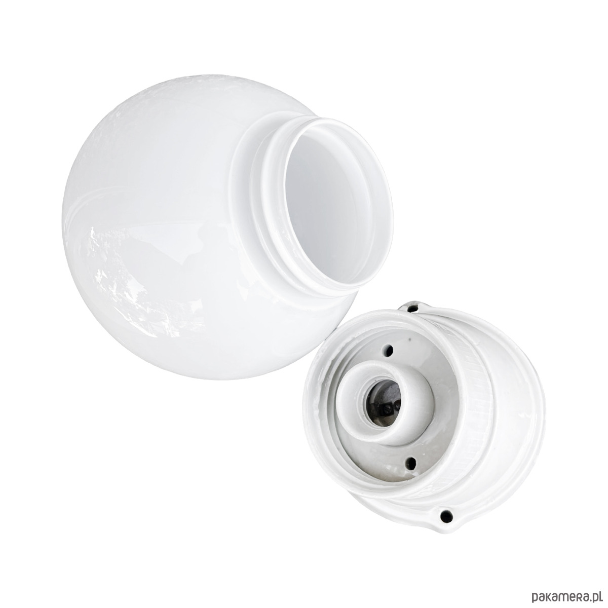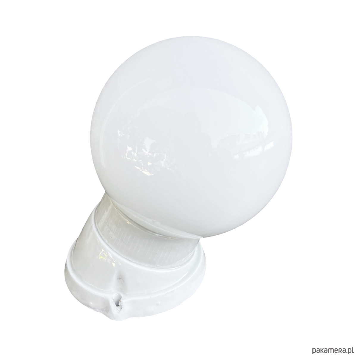 Oryginalny kinkiet ścienny w stylu industrialnym marki Lindner, pochodzący z lat 60. XX wieku. Lampa składa się z ceramicznej, skośnej podstawy oraz klosza w formie białej, szklanej kuli, co nadaje jej eleganckiego, minimalistycznego charakteru.