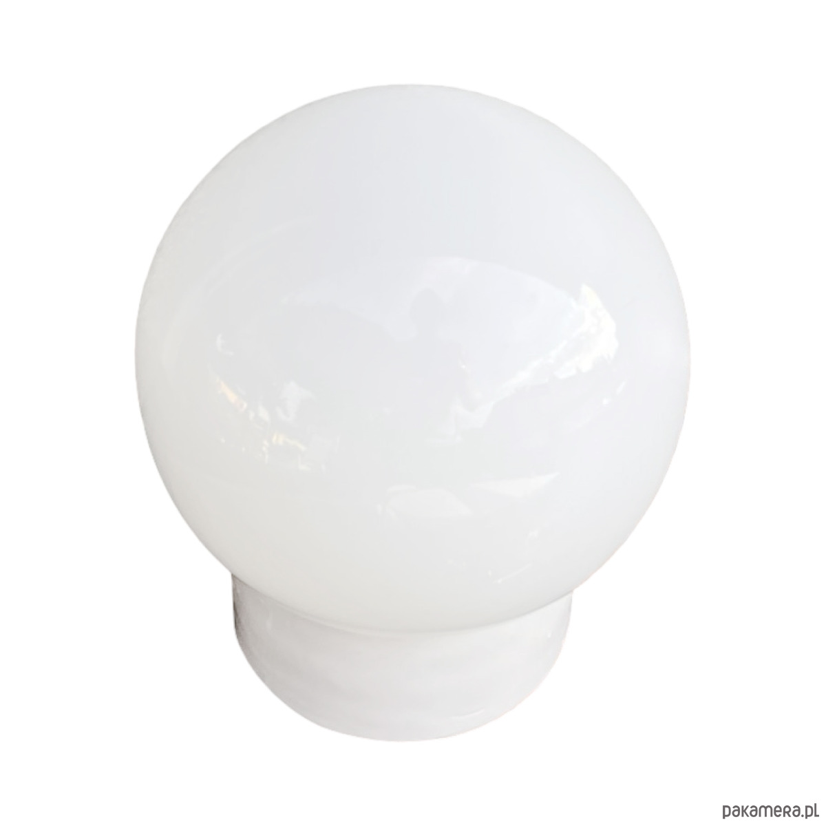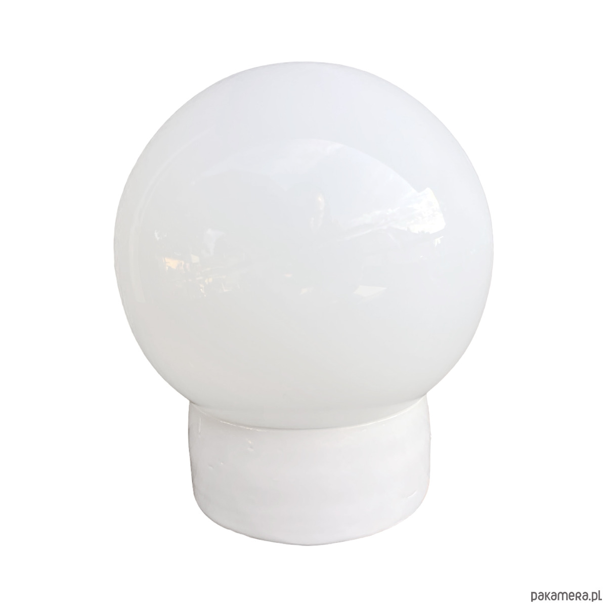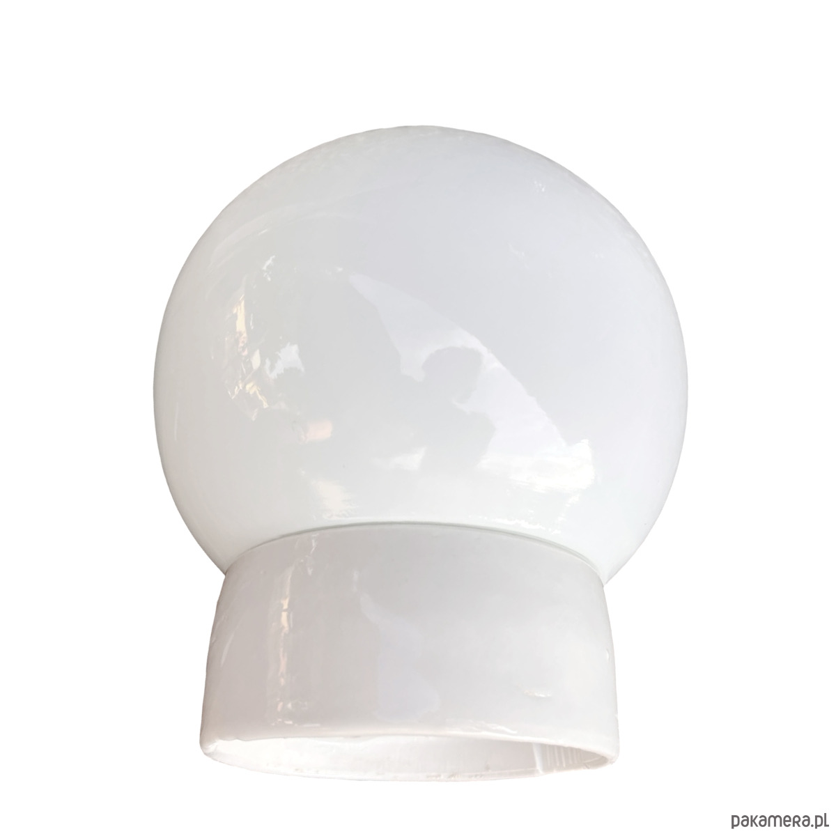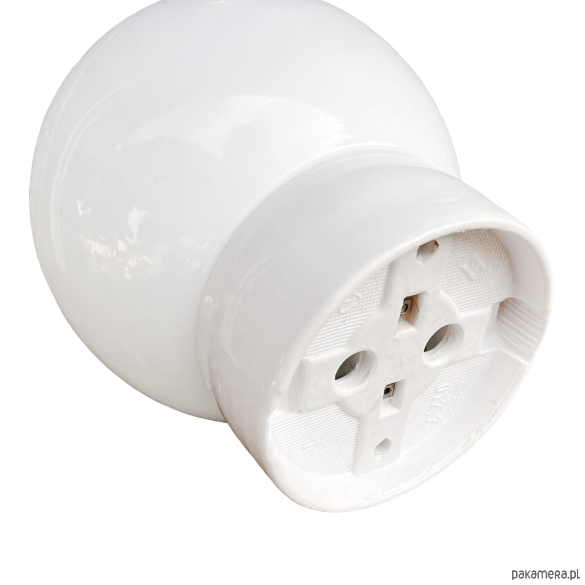 Oryginalny kinkiet ścienny wyprodukowany w latach 60. XX wieku przez Fabrykę Materiałów Światłoczułych FOTON w Polsce. Model ten charakteryzuje się ceramiczną, prostą podstawą oraz dużym kloszem w formie białej, szklanej kuli, typowym dla oświetlenia przemysłowego i użytkowego tamtego okresu.