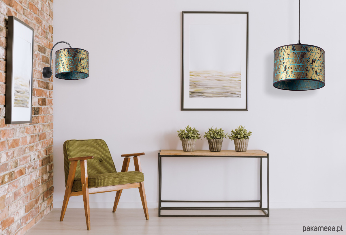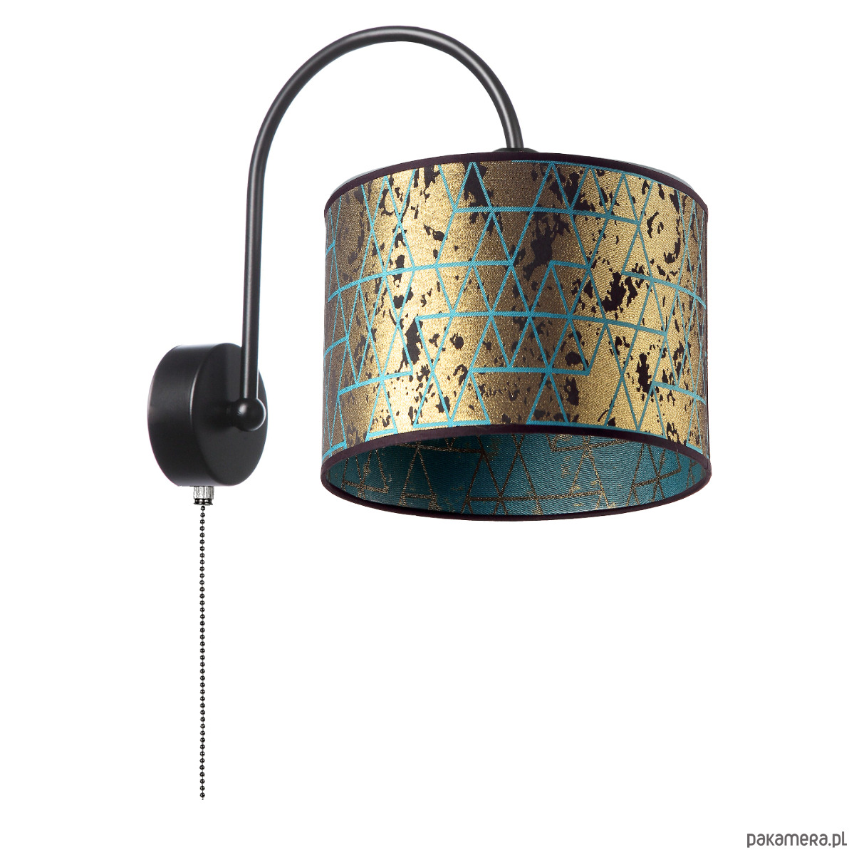 Nowoczesny kinkiet ścienny z efektownym abażurem w czarno - złote geometryczne wzory na turkusowym tle.