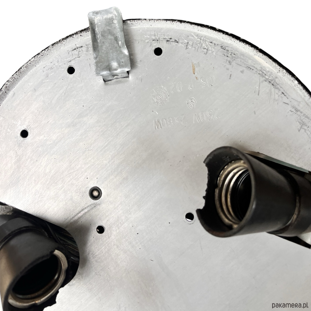 Stan bardzo dobry, szkło bez pęknięć. Delikatne, naturalne ślady czasu. W pełni funkcjonalna — oprawa na 2 żarówki E27. Możliwość montażu w pionie lub poziomie.