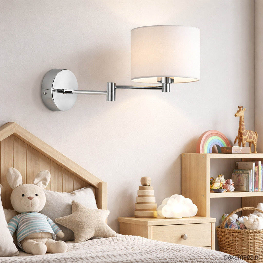 Jeśli cenisz sobie innowacyjne rozwiązania, koniecznie zwróć uwagę na nasz model kinkietu BRAGE. Ta lampa ścienna odznacza się niezwykłą funkcjonalnością i nieprzeciętnym designem a to wszystko dzięki ruchomemu ramieniu, które pozwala na dostosowanie kąta padania światła w dokładnie upatrzone przez nas miejsce. Takie nowoczesne rozwiązania bardzo przydają się w pokojach dziecięcych. Za pomocą tak poręcznego kinkietu, idealnie doświetlisz kącik zabaw malucha, biurko lub łóżeczko. Oświetlenie zawiera miejsce na jedną żarówkę o gwincie E27.