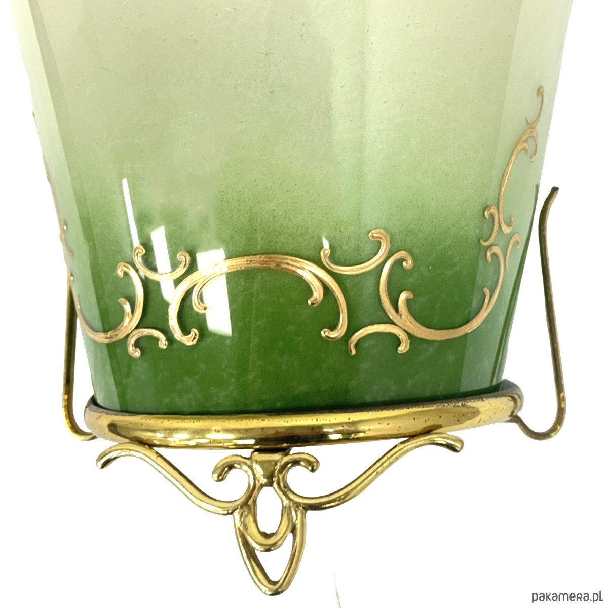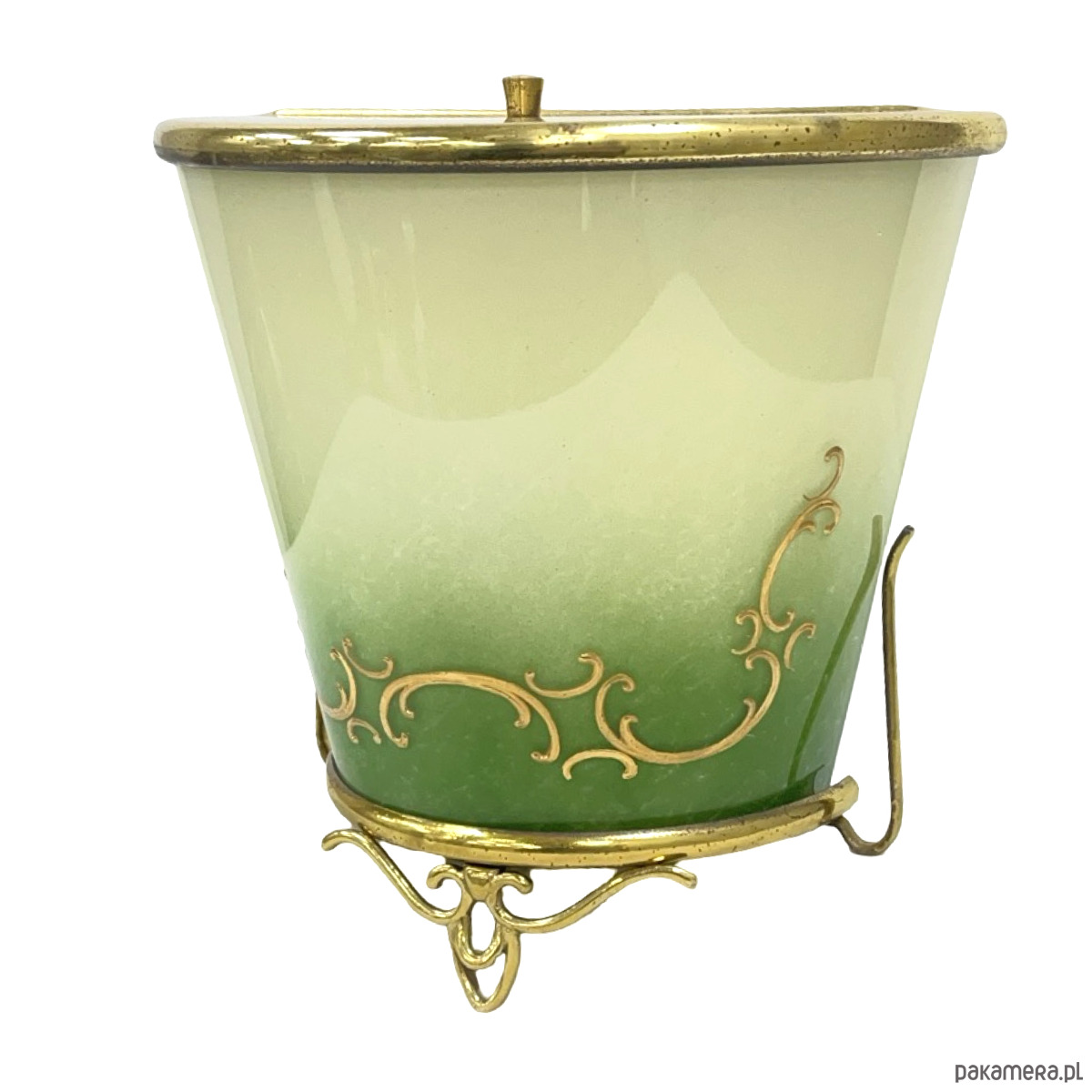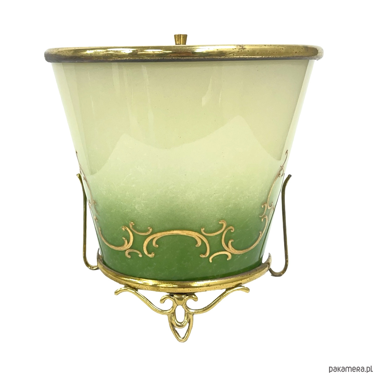 Dekoracyjne naczynie ze szkła artystycznego osadzone w ozdobnej mosiężnej oprawie, utrzymane w eleganckiej stylistyce vintage. Szkło w pięknym zielono-mlecznym gradiencie, z delikatnymi złoconymi ornamentami, nadaje całości bardzo szlachetny, klasyczny charakter.