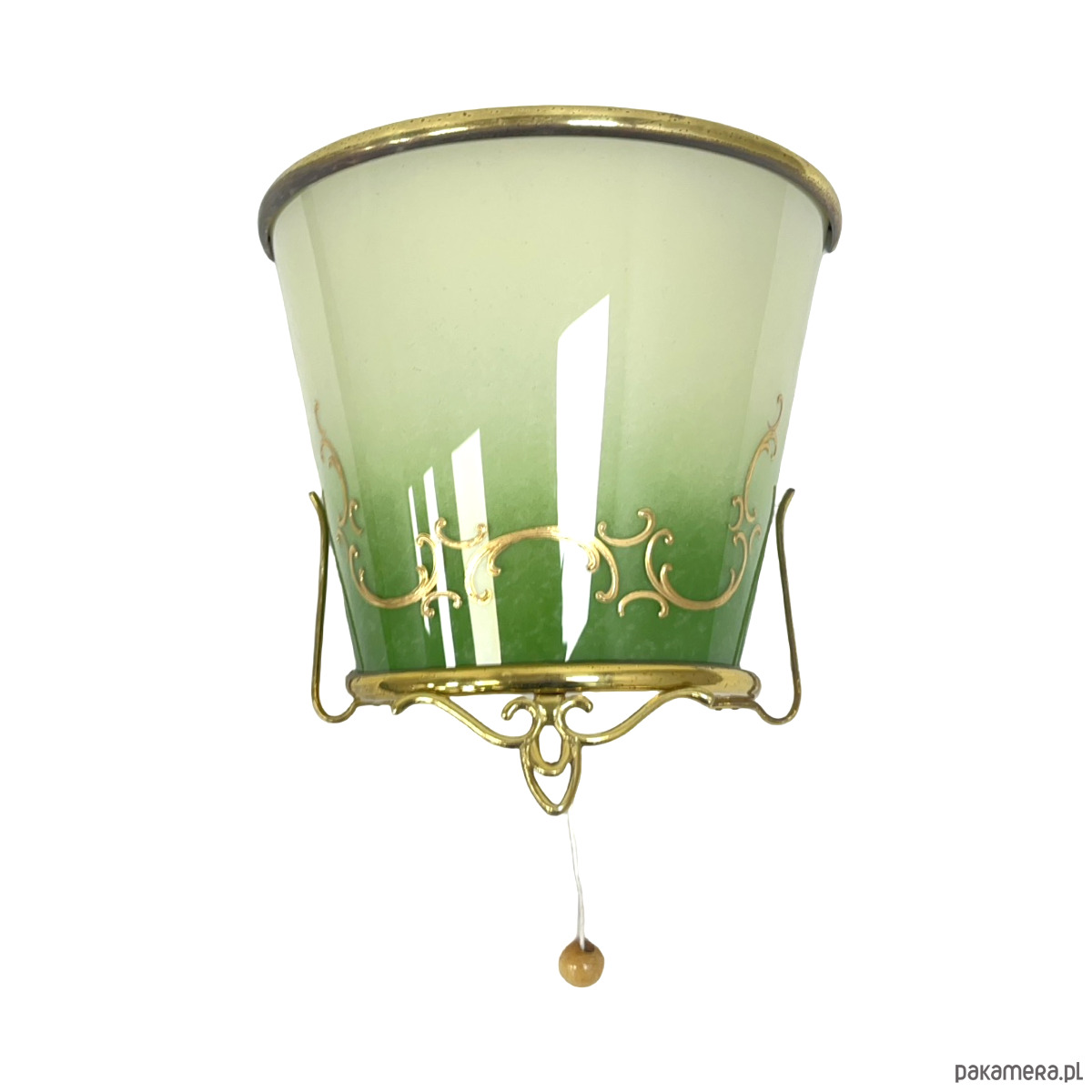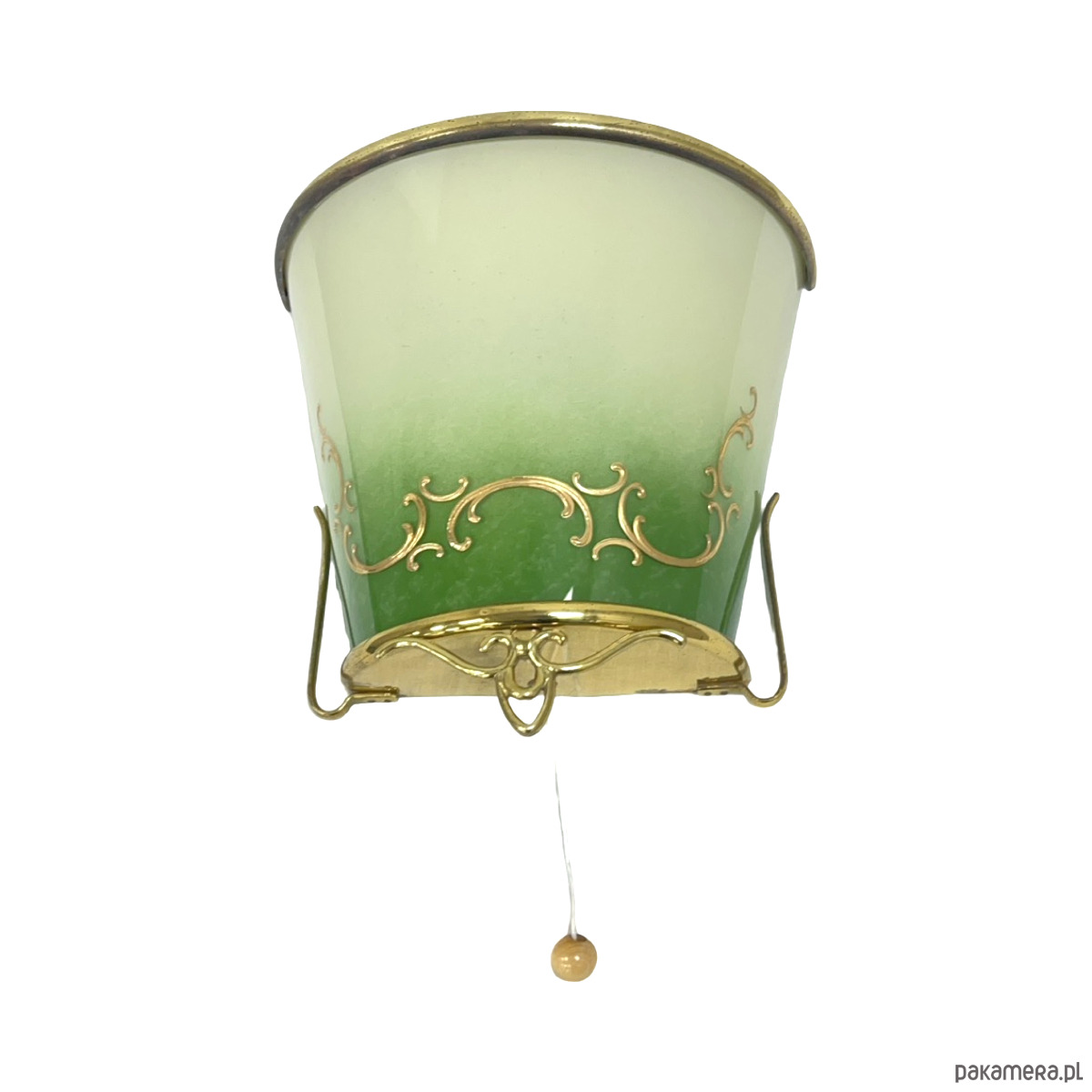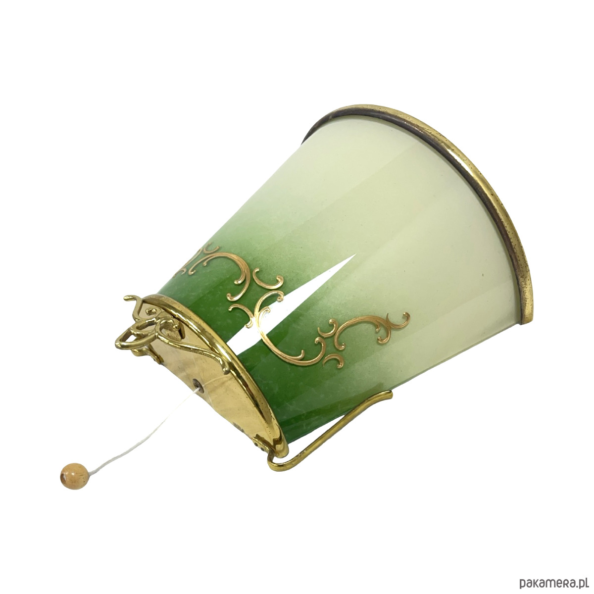 Dekoracyjne naczynie ze szkła artystycznego osadzone w ozdobnej mosiężnej oprawie, utrzymane w eleganckiej stylistyce vintage. Szkło w pięknym zielono-mlecznym gradiencie, z delikatnymi złoconymi ornamentami, nadaje całości bardzo szlachetny, klasyczny charakter.
