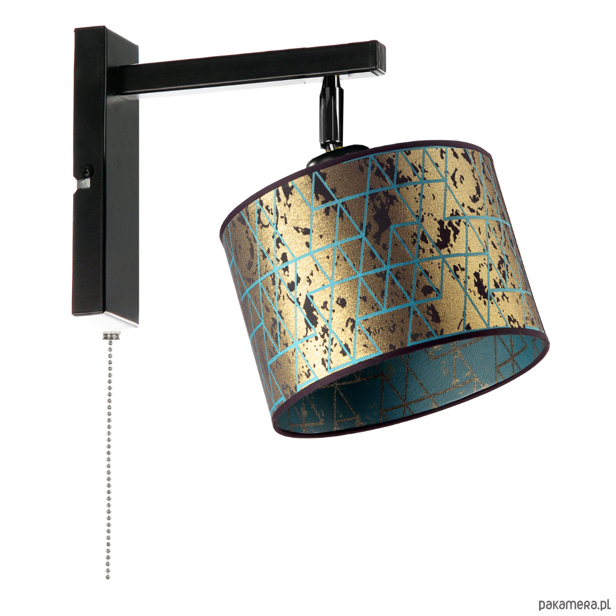 Nowoczesny kinkiet ścienny z efektownym abażurem w czarno - złote geometryczne wzory na turkusowym tle.