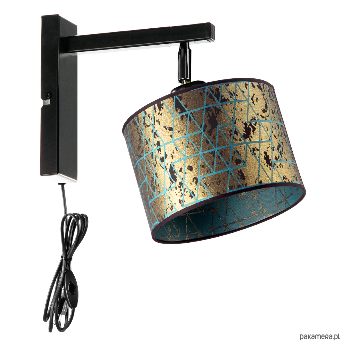 Nowoczesny kinkiet ścienny z efektownym abażurem w czarno - złote geometryczne wzory na turkusowym tle.