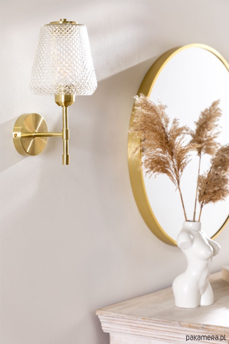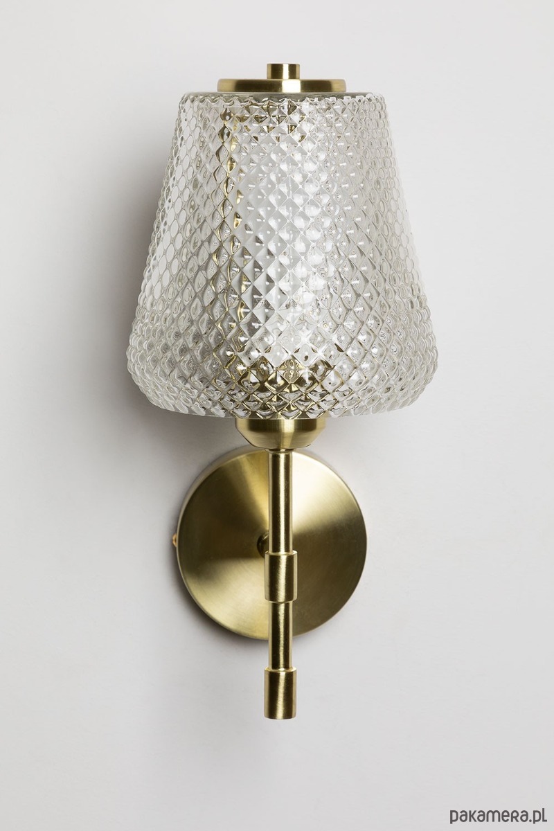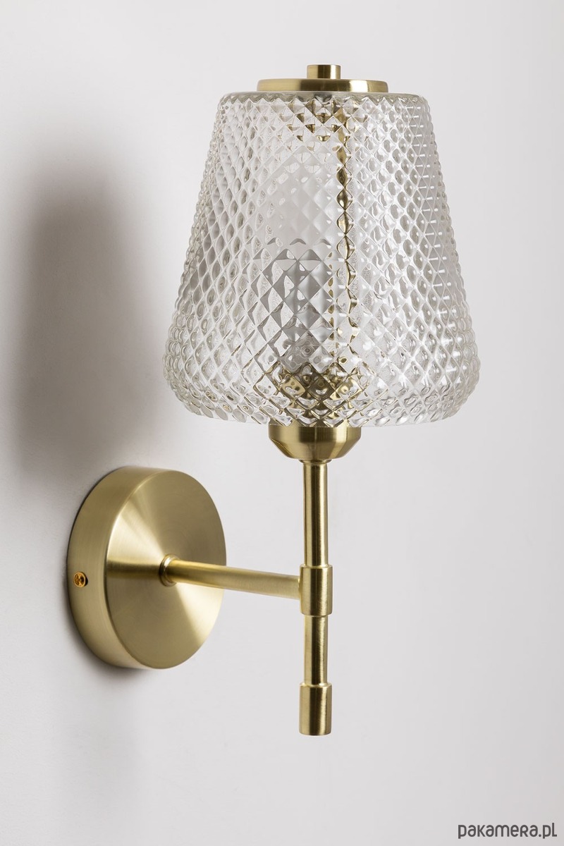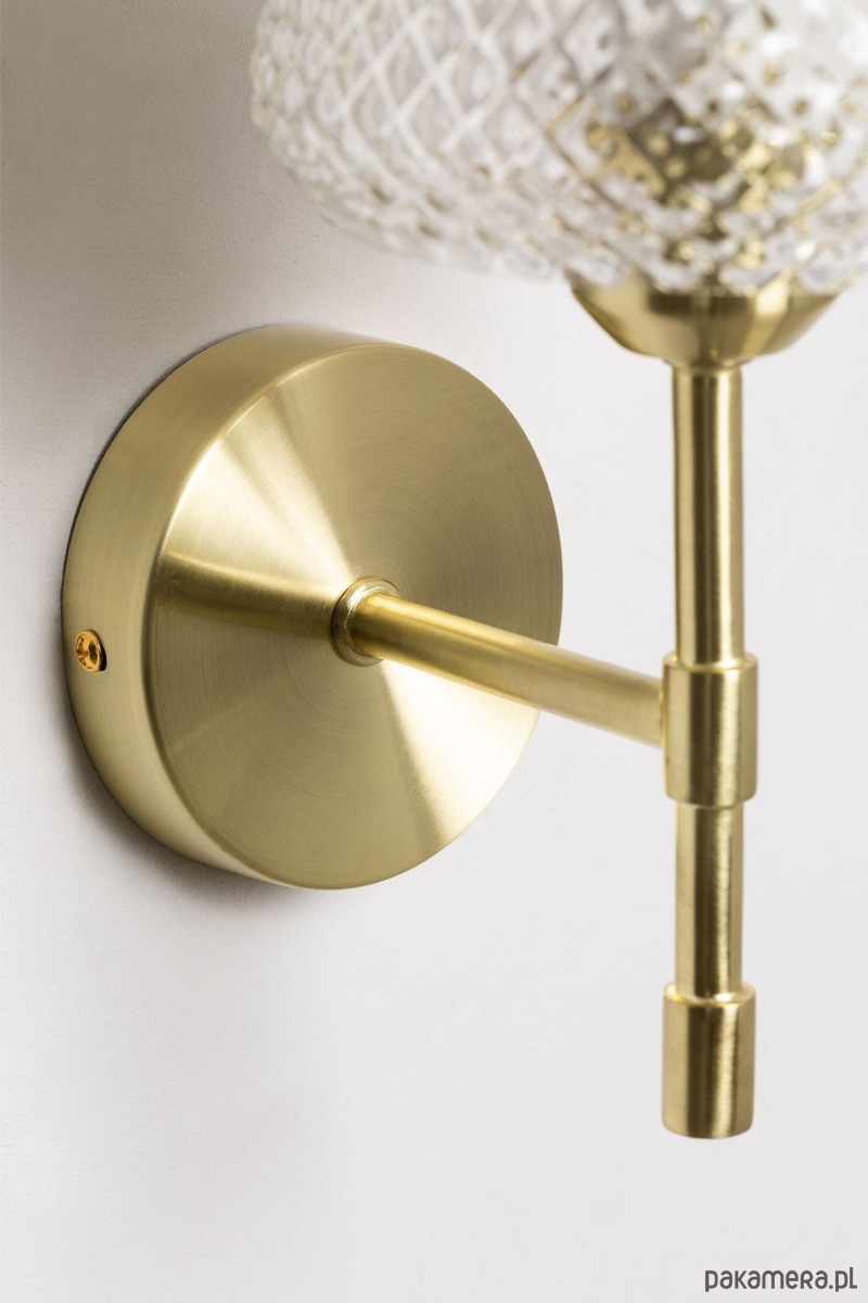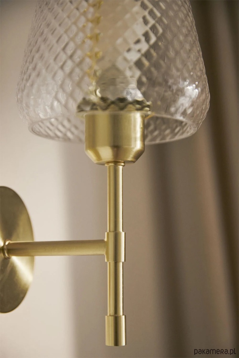Efektowna lampa ścienna wykonana z metalu w kolorze szczotkowanego złota. Szklany, tłoczony abażur robi ogromne wrażenie.