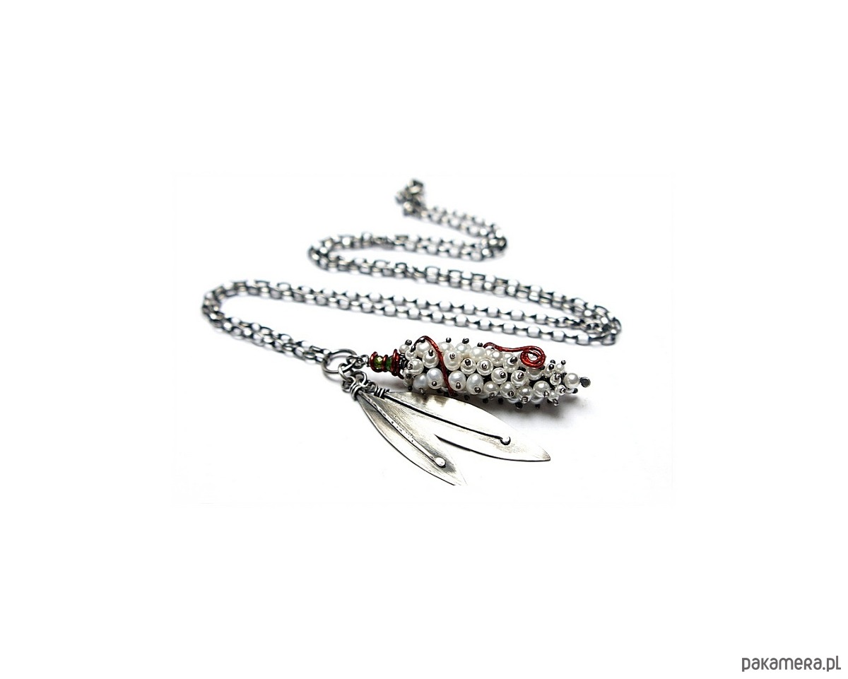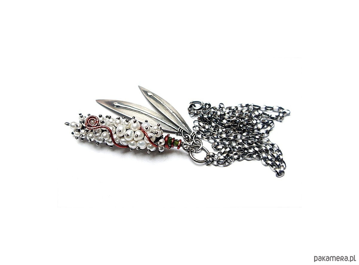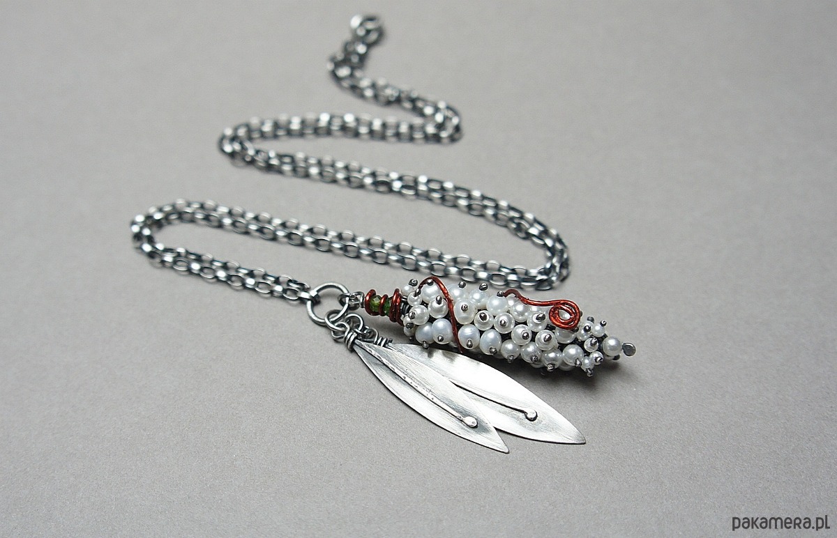 Naszyjnik wykonany własnoręcznie od podstaw ze srebra [pr. 925 i 930 ] w połączeniu z perłami naturalnymi [5mm], perełkami seashell [2mm i 4mm],fasetowanymi diopsydami [4mm i 3mm] .Wielkość perłowego kokonu [50mm] owinięty drutem miedzianym .Wielkość listków około [40mm i 45mm] . Srebro oksydowane i przetarte. Całkowita długość naszyjnika 64,5cm. Biżuteria ozdobnie zapakowana.