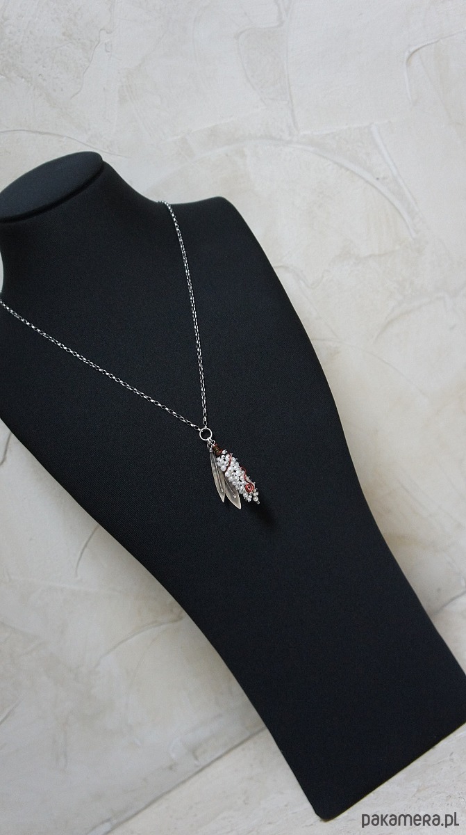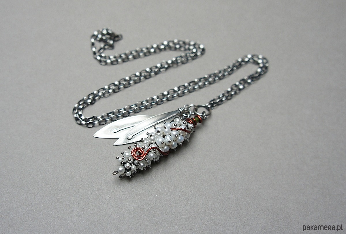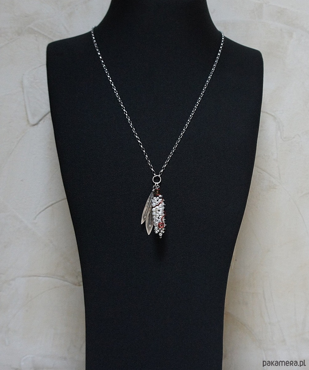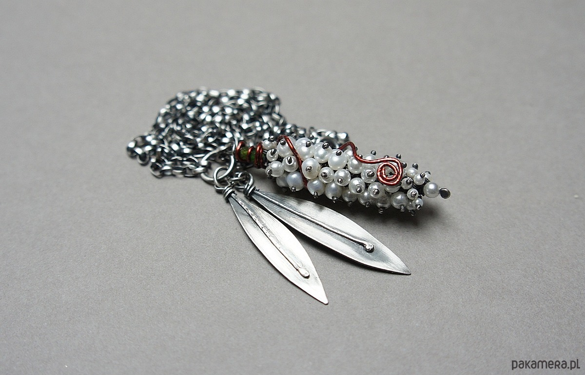 Naszyjnik wykonany własnoręcznie od podstaw ze srebra [pr. 925 i 930 ] w połączeniu z perłami naturalnymi [5mm], perełkami seashell [2mm i 4mm],fasetowanymi diopsydami [4mm i 3mm] .Wielkość perłowego kokonu [50mm] owinięty drutem miedzianym .Wielkość listków około [40mm i 45mm] . Srebro oksydowane i przetarte. Całkowita długość naszyjnika 64,5cm. Biżuteria ozdobnie zapakowana.