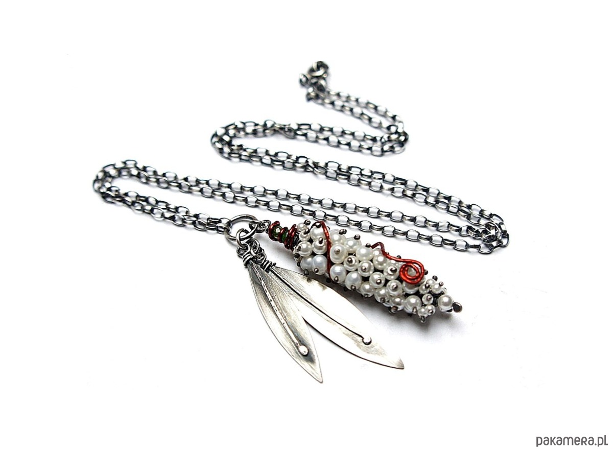 Naszyjnik wykonany własnoręcznie od podstaw ze srebra [pr. 925 i 930 ] w połączeniu z perłami naturalnymi [5mm], perełkami seashell [2mm i 4mm], fasetowanymi diopsydami [4mm i 3mm]. Wielkość perłowego kokonu [50mm] owinięty drutem miedzianym. Wielkość listków około [40mm i 45mm]. Srebro oksydowane i przetarte. Całkowita długość naszyjnika 64,5cm. Biżuteria ozdobnie zapakowana.