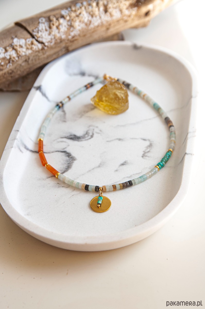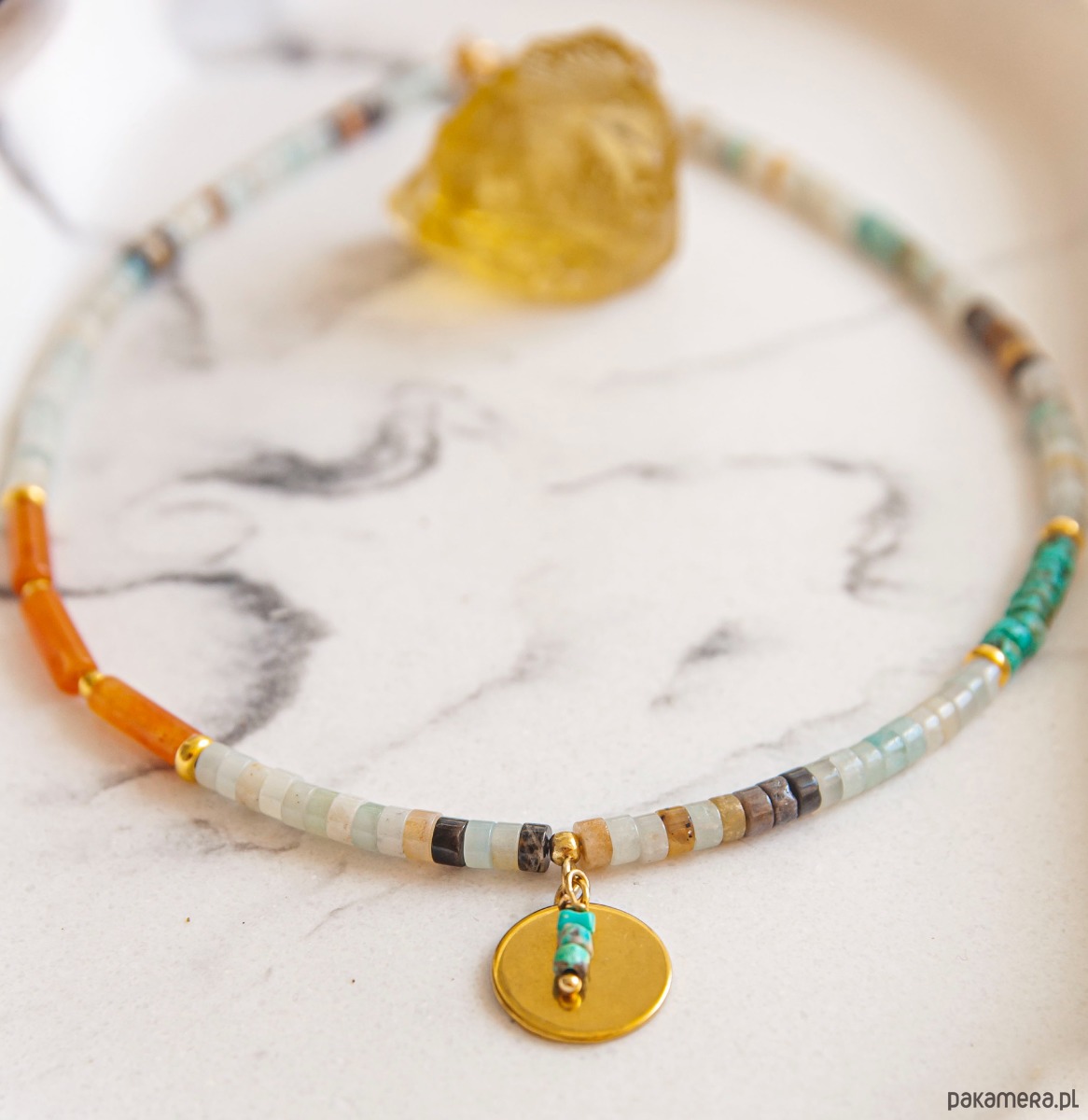 Naszyjnik z agatem, turkusem, awenturynem bursztynowym. Całość doprawia zawieszka słońce i turkusy.
