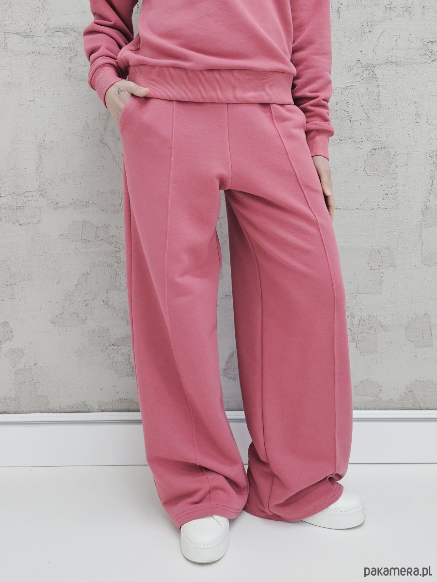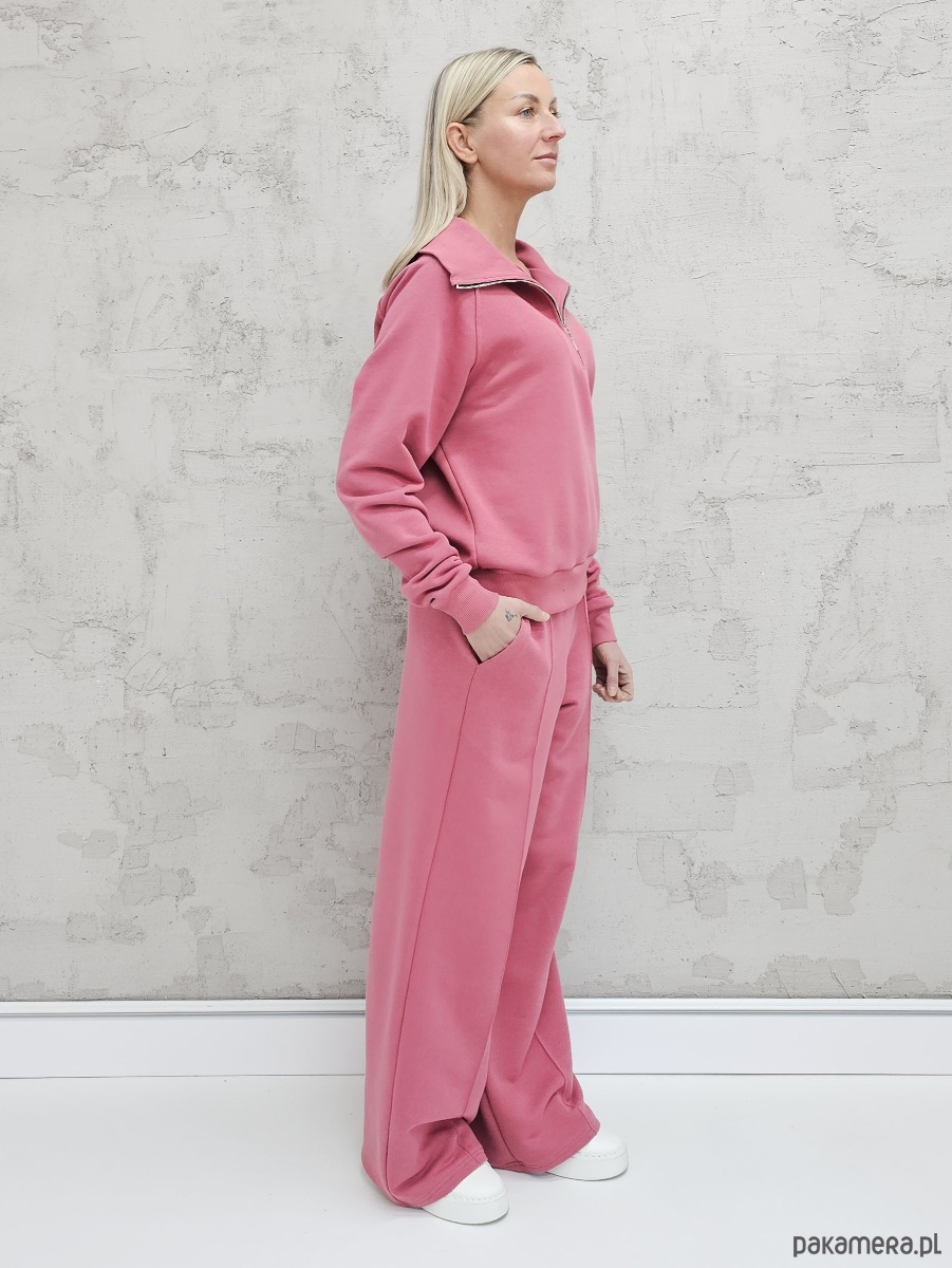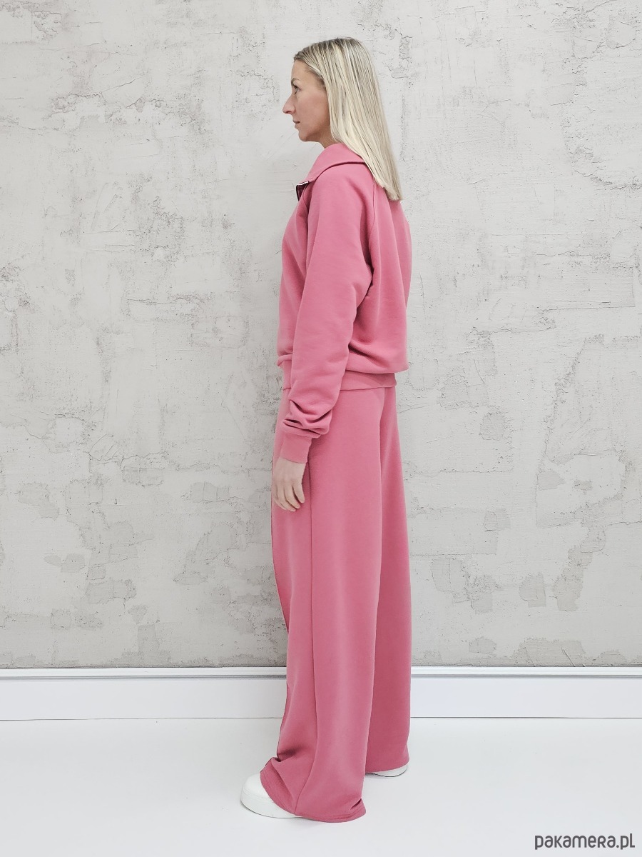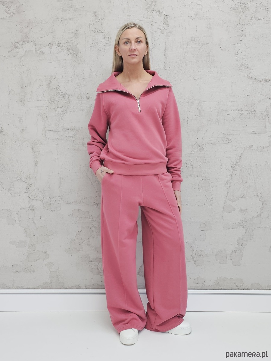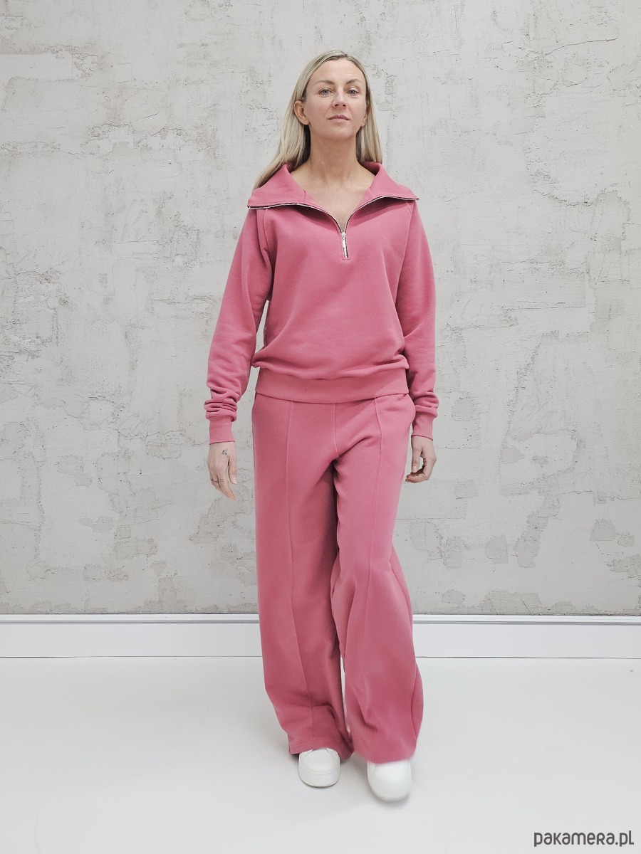 OPIS PRODUKTU- Komfortowy komplet Kissa uszyty z naszego sygnowanego materiału superSOFT™. Komplet obejmuje luźną, bardzo wygodną bluzę z rozpinanym dekoltem oraz spodnie o luźnym kroju z szerokimi nogawkami i ozdobnym szwem na przodzie.