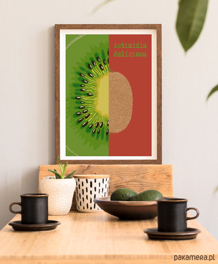 Plakat z autorską grafiką z serii Juicy fruits (Soczyste owoce). Przedstawia kiwi w dwóch odsłonach – pół owocu z zewnątrz i zbliżenie na smakowity miąższ. Oryginalna dekoracja do wymarzonej kuchni, salonu i jadalni.
