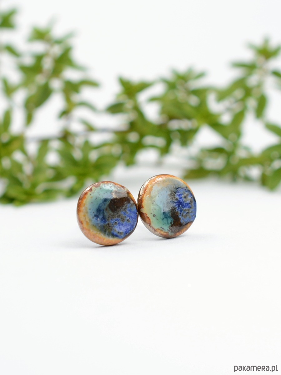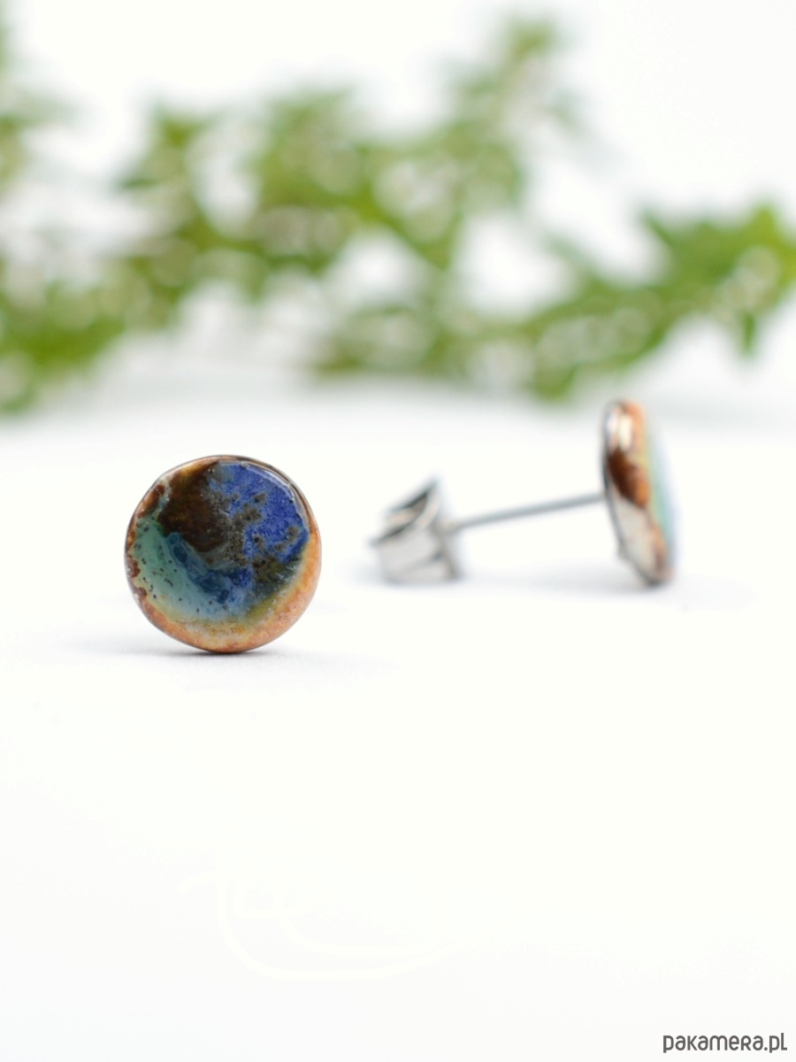 Kolczyki to małe kółeczka poszkliwione mieszanką szkliw w odcieniach brązu i niebieskości . Elementy o średnicy 8 mm i grubości 1,5 mm są szkliwione jednostronnie. Elementy ceramiczne zostały przeze mnie dopracowane w najmniejszym szczególe-boczne krawędzie poszkliwiłam w kolorze brązu z delikatnym połyskiem. Kolczyki są solidnie umocowane na sztyftach ze stali chirurgicznej - antyalergiczna w kolorze oksydowanego srebra. Bardzo serdecznie polecam!! Wysyłam w ozdobnym pudełeczku.