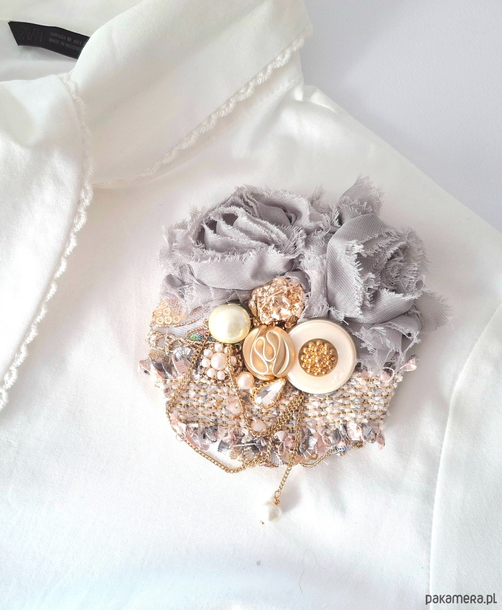 Broszka wykonana w technice kolażu w pojedynczym egzemplarzu z myślą o osobach, które szukają urozmaicenia przy codziennych stylizacjach. Jest w niej zawarte wiele struktur i odcieni.Cieple beże,kremy i złoto przełamane stalowym akcentem dodają szyku kreacji będąc jednocześnie bardzo uniwersalnym dodatkiem który można wykorzystać do wielu stylizacji.