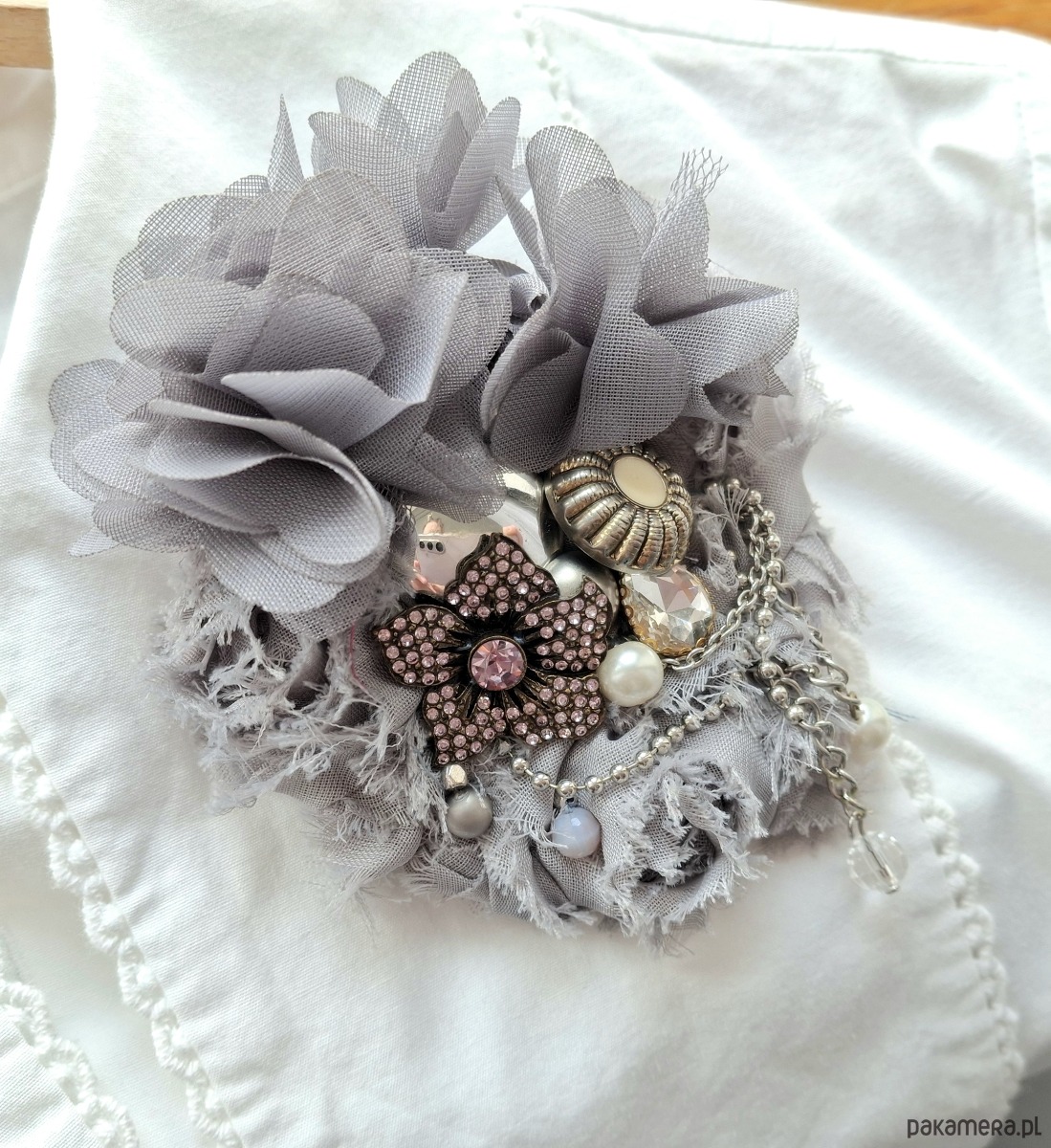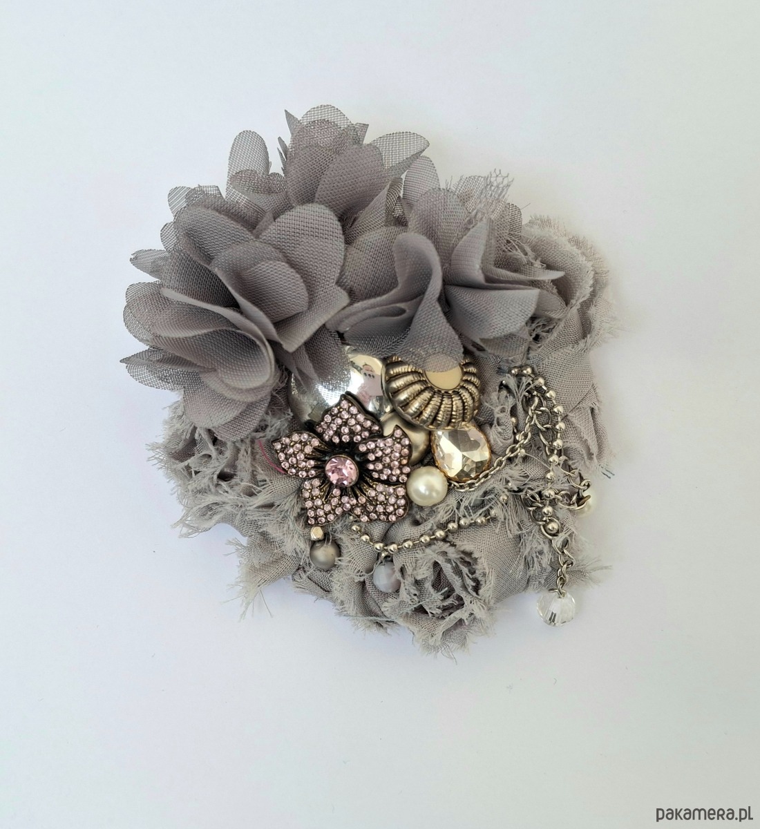 Broszka wykonana w technice kolażu w pojedynczym egzemplarzu z myślą o osobach, które szukają urozmaicenia przy codziennych stylizacjach. Jest w niej zawarte wiele struktur i odcieni.Przyjemmy stalowy kolor przełamany jasną szarością i srebrem dodają szyku kreacji będąc jednocześnie bardzo uniwersalnym dodatkiem który można wykorzystać do wielu stylizacji.