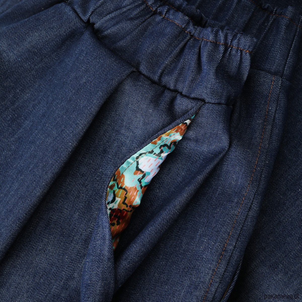 Przód spodni urozmaicają symetrycznie rozmieszczone szerokie zaszewki. Po bokach dwie spore i wygodne kieszenie z wzorzystą podszewką. Góra wykończona szerokim pasem z wszytą wewnątrz gumą.
