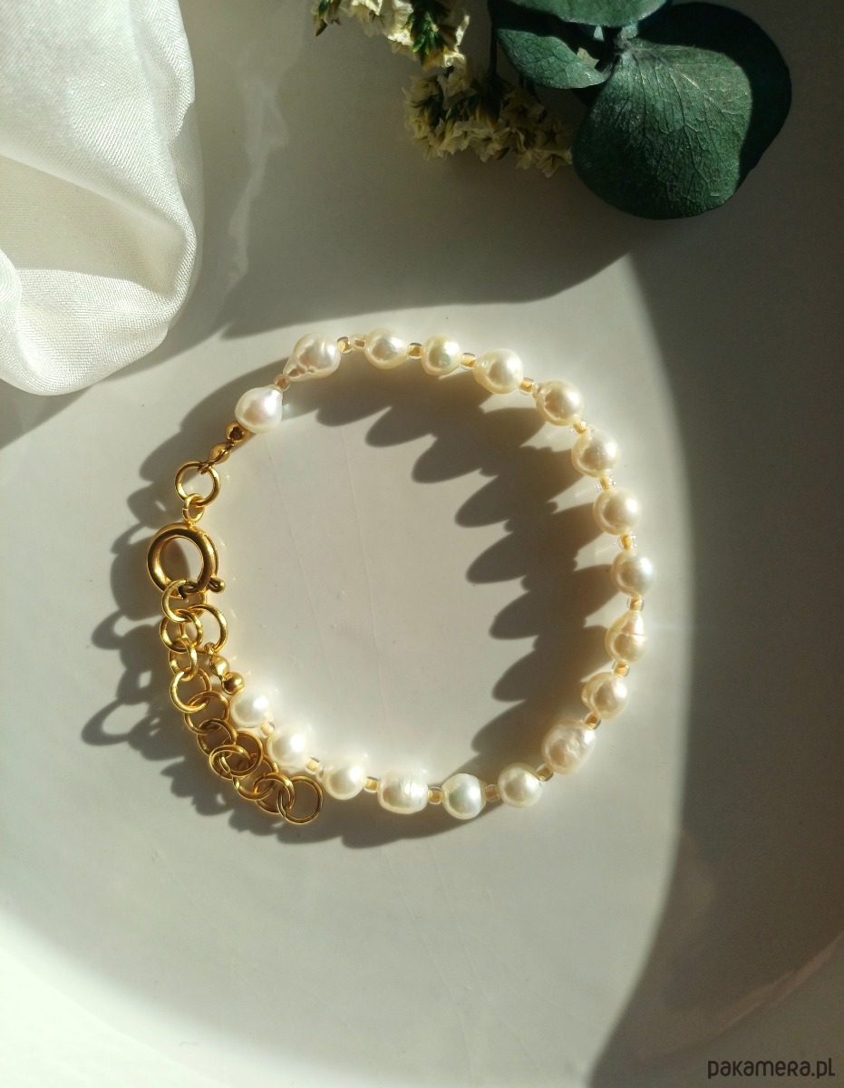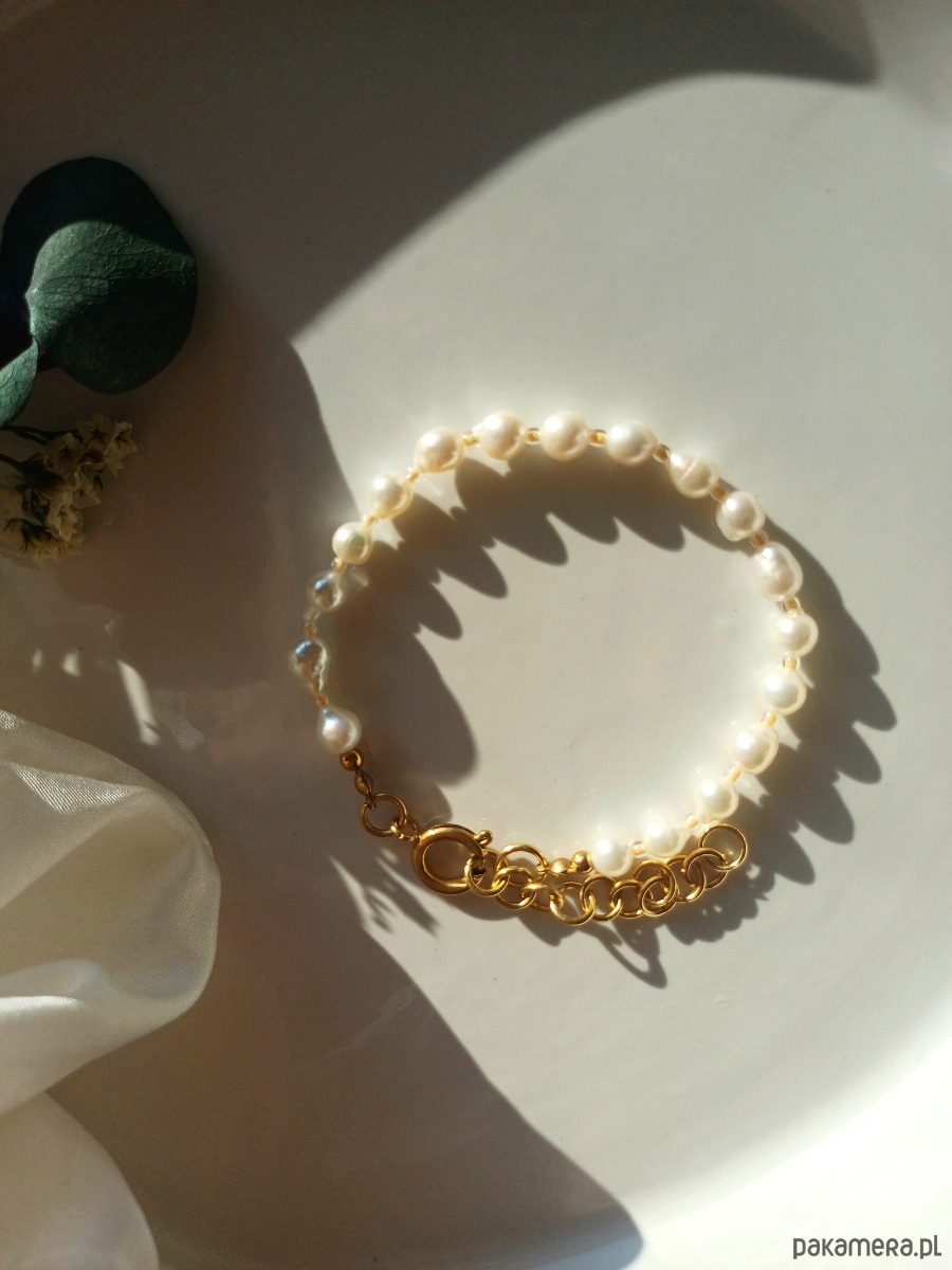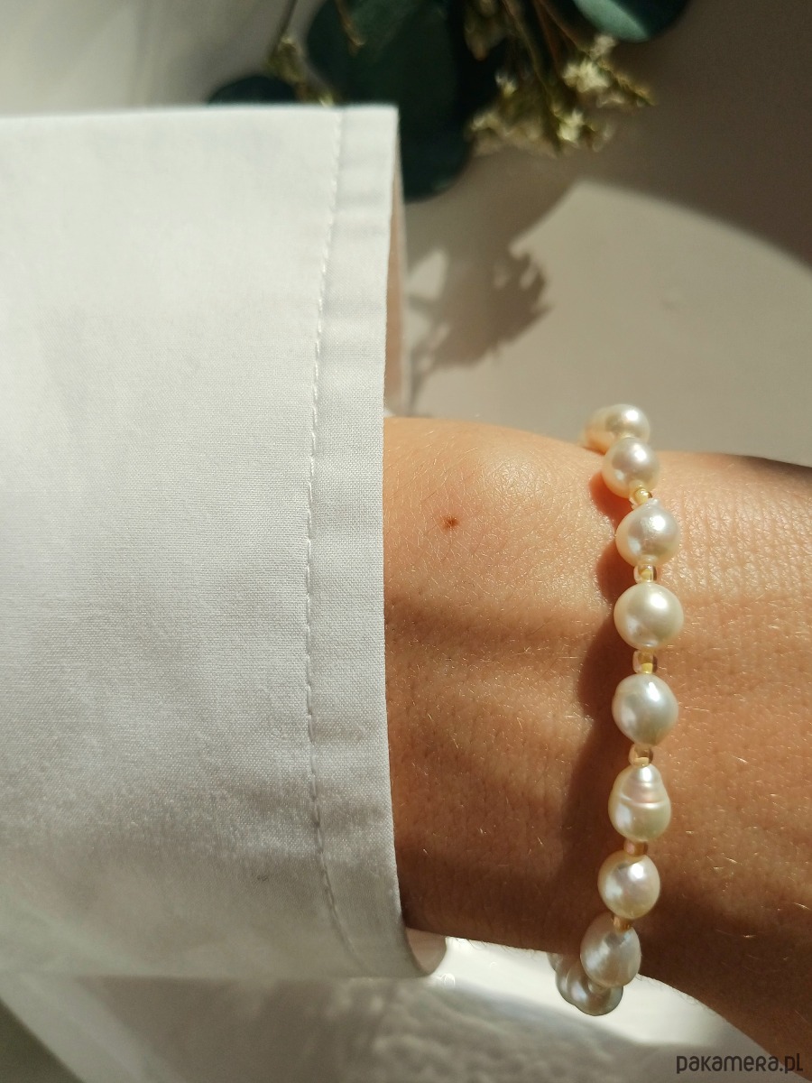 Bransoletka : perły naturalne słodkowodne : 6 - 7 mm, koraliki szklane : 2 mm, wygodne zapięcie typu federing: stal szlachetna