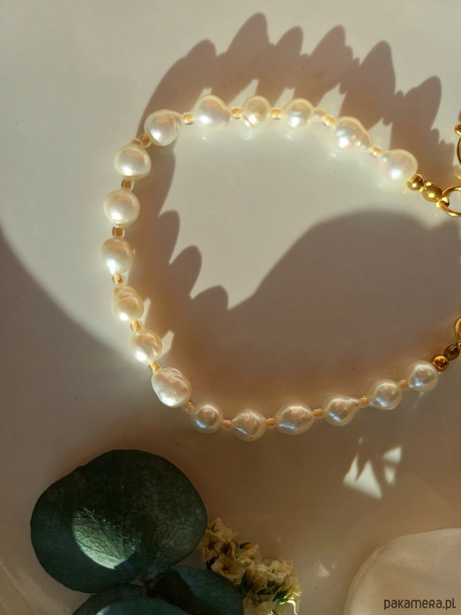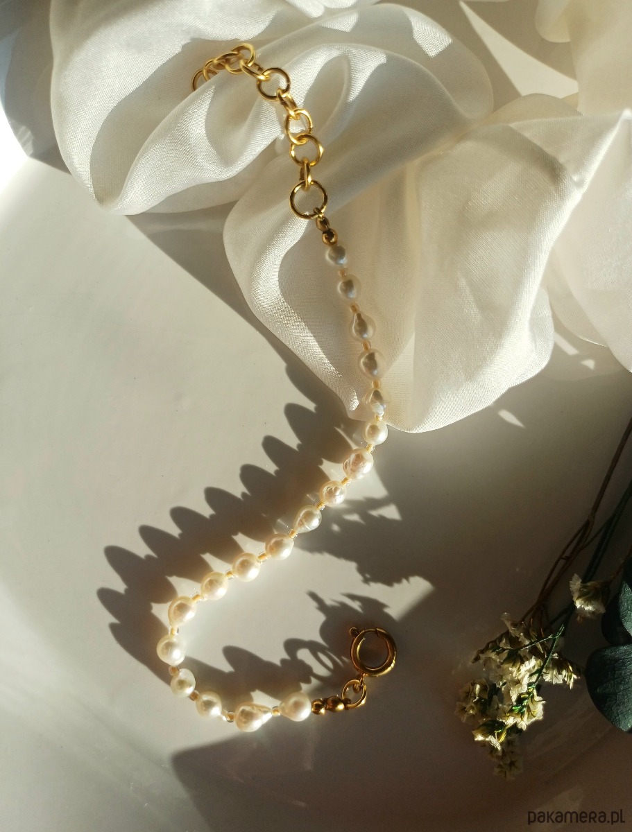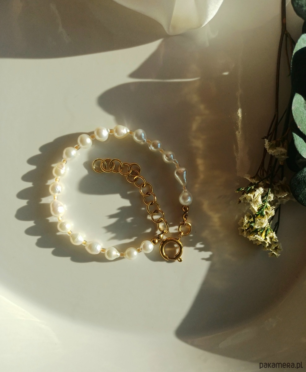 Bransoletka : perły naturalne słodkowodne : 6 - 7 mm, koraliki szklane : 2 mm, wygodne zapięcie typu federing: stal szlachetna