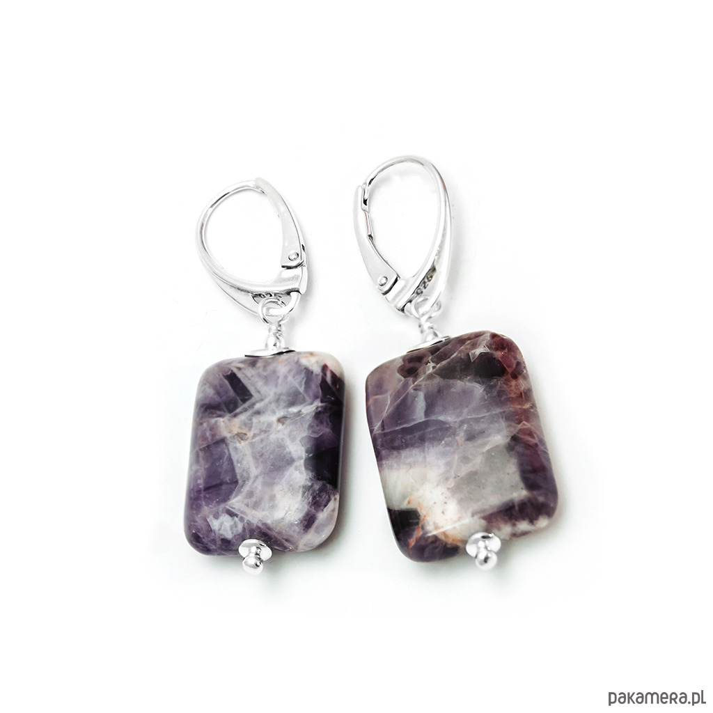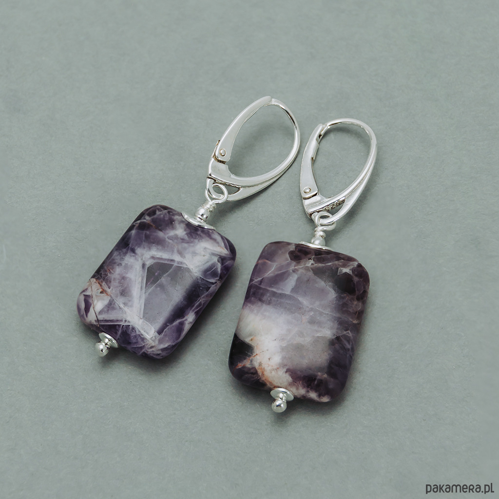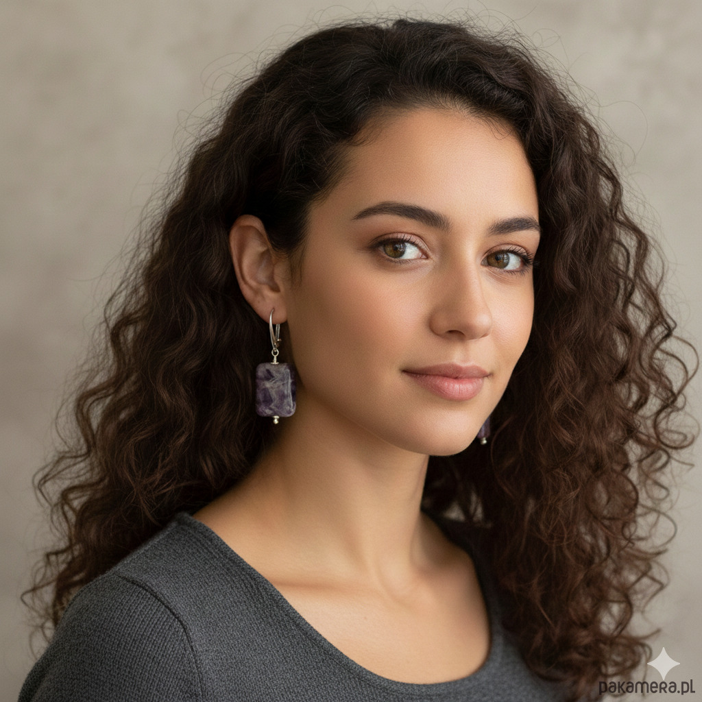 Eleganckie kolczyki kamieniami półszlachetnymi - z ametystem. Na wygodnych, zapinanych biglach angielskich, dobrze trzymają się na uszach.