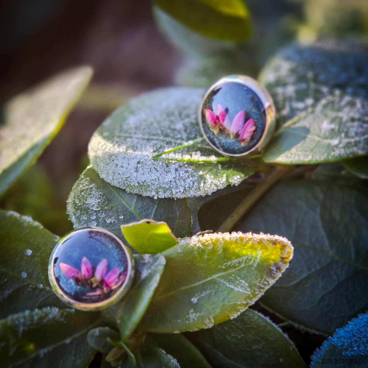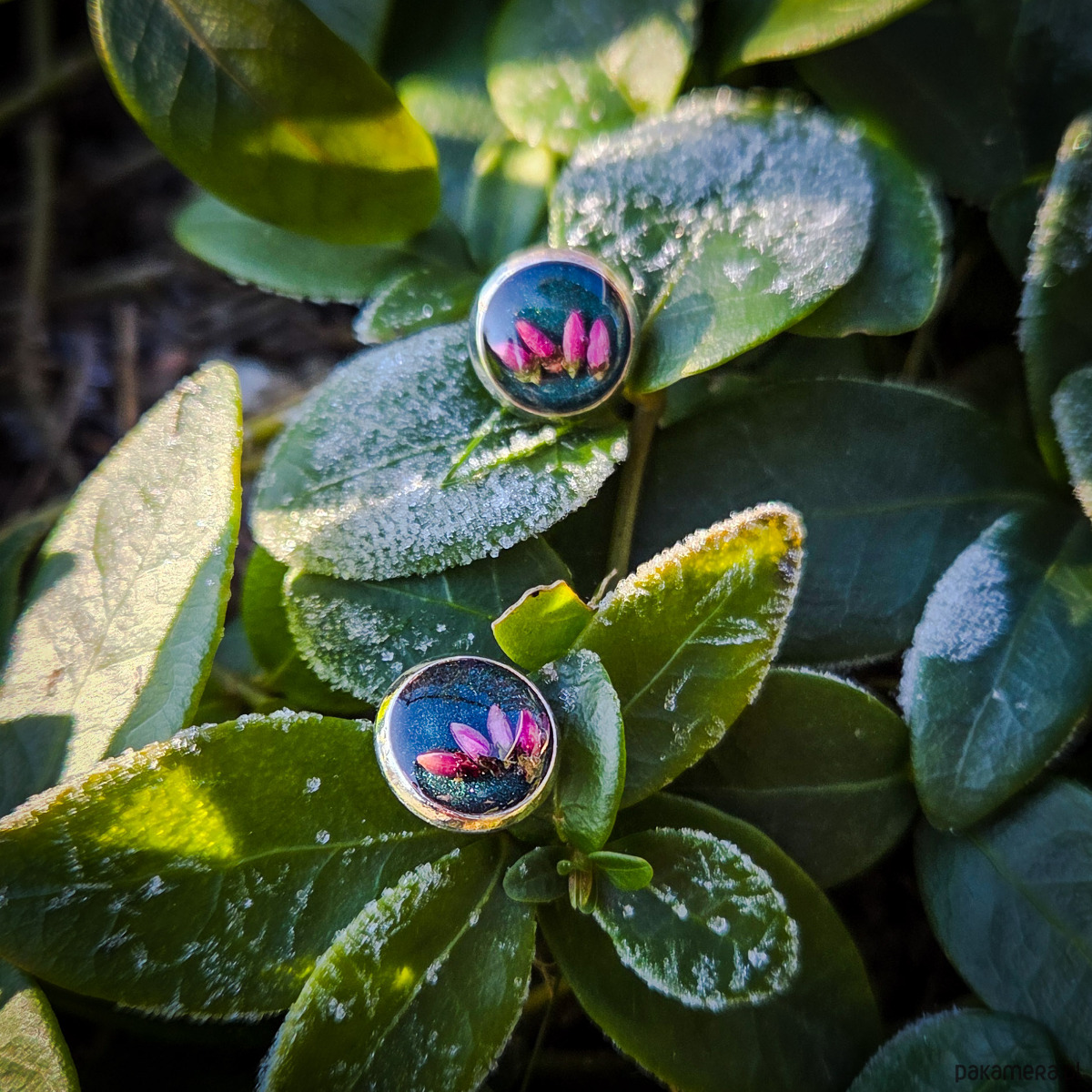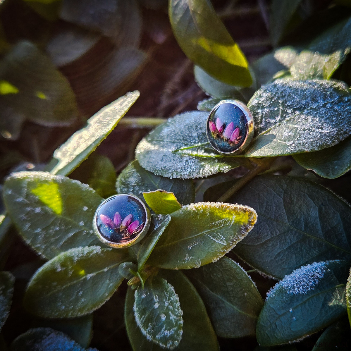 Kolczyki ze stali chirurgicznej z zatopionymi płatkami wrzosów.