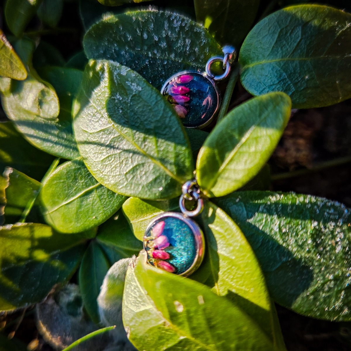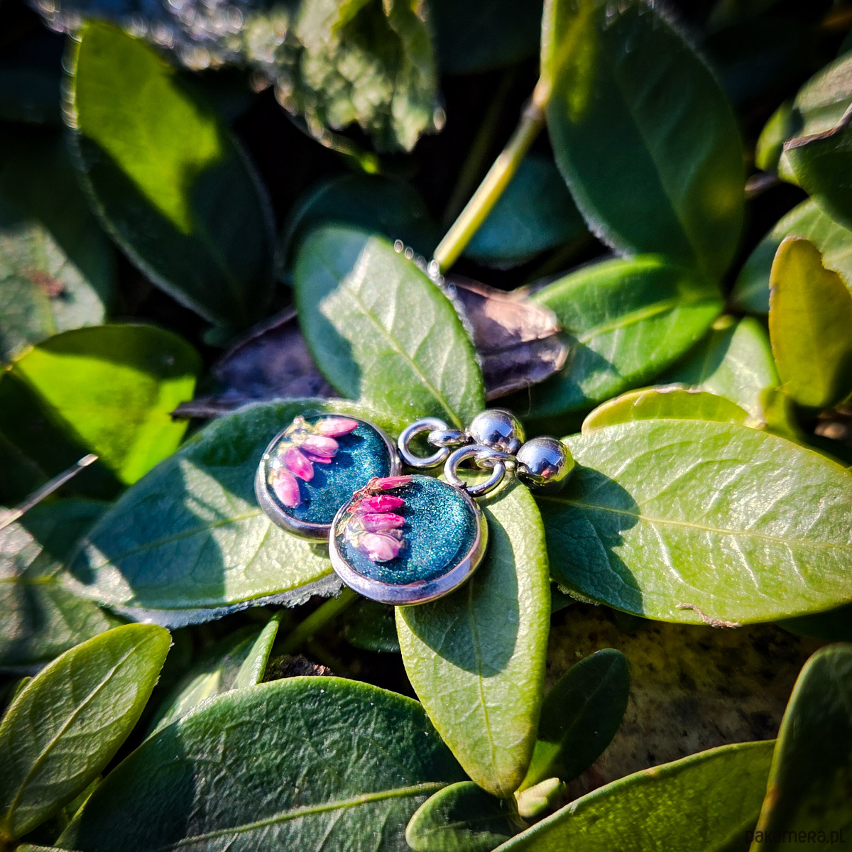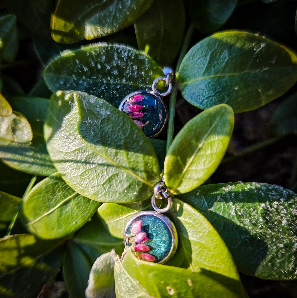 Kolczyki ze stali chirurgicznej z zatopionymi płatkami wrzosów.