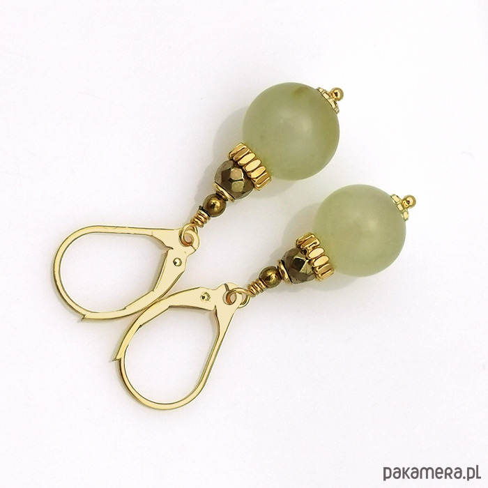 Śliczne kolczyki z pozłacanego srebra z jadeitami i złoconymi hematytami. Kolczyki zawieszone na zamykanych biglach angielskich dobrze trzymają się na uszach.