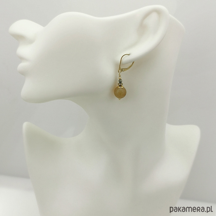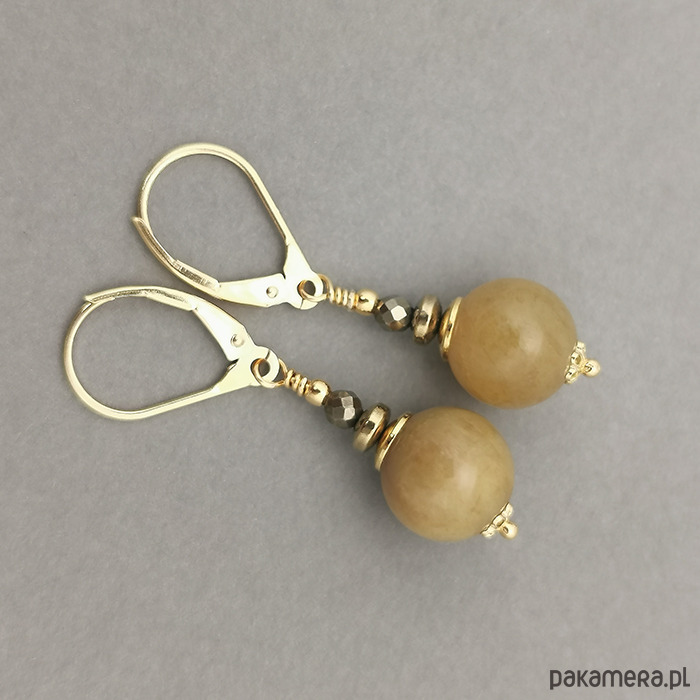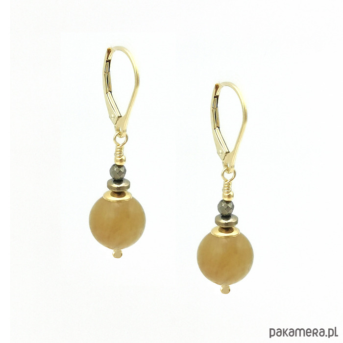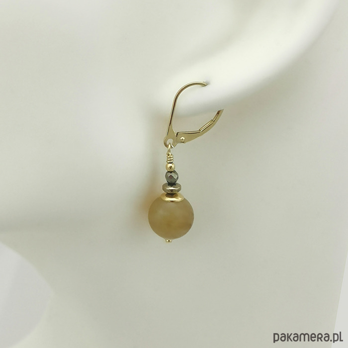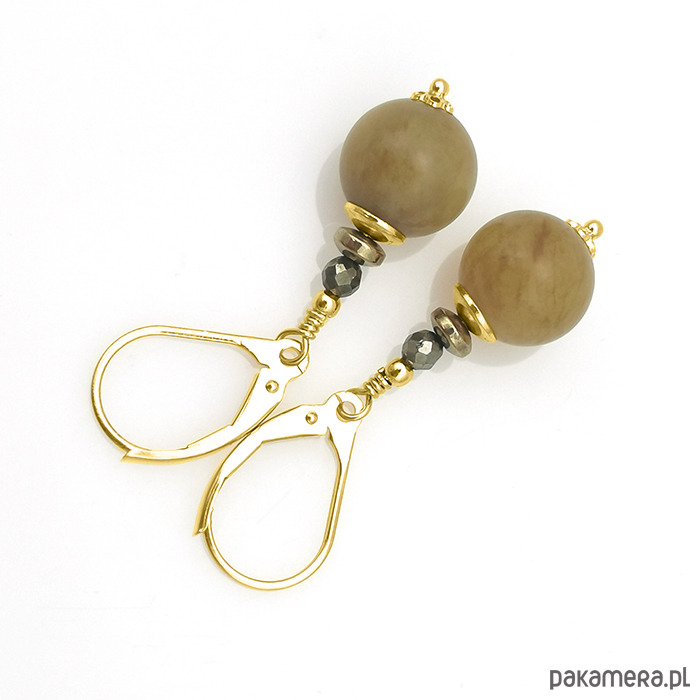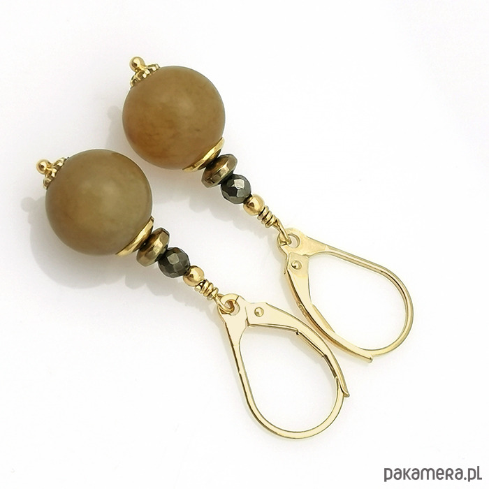 Śliczne kolczyki z pozłacanego srebra z jadeitami w kolorze oliwkowym oraz złoconymi hematytami. Kolczyki są zawieszone na zamykanych biglach angielskich, dobrze trzymają się na uszach.